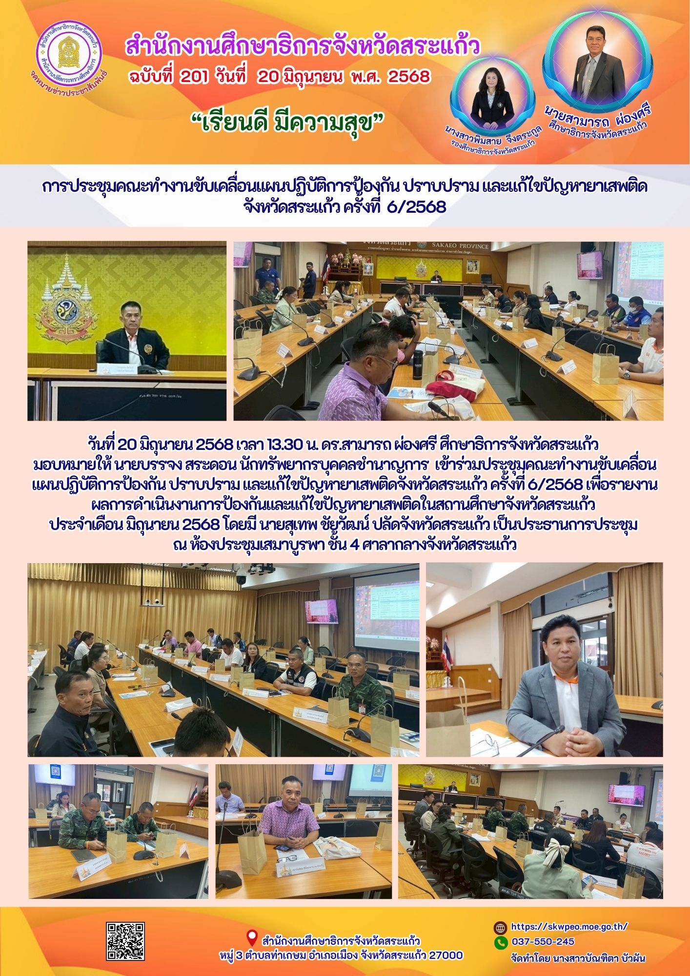 20 มิ.ย. 68 (ศธจ.สระแก้ว) เข้าร่วมประชุมคณะทำงานขับเคลื่อนแผนปฏิบัติการป้องกัน ปราบปราม และแก้ไขปัญหายาเสพติดจังหวัดสระแก้ว ครั้งที่ 6/2568