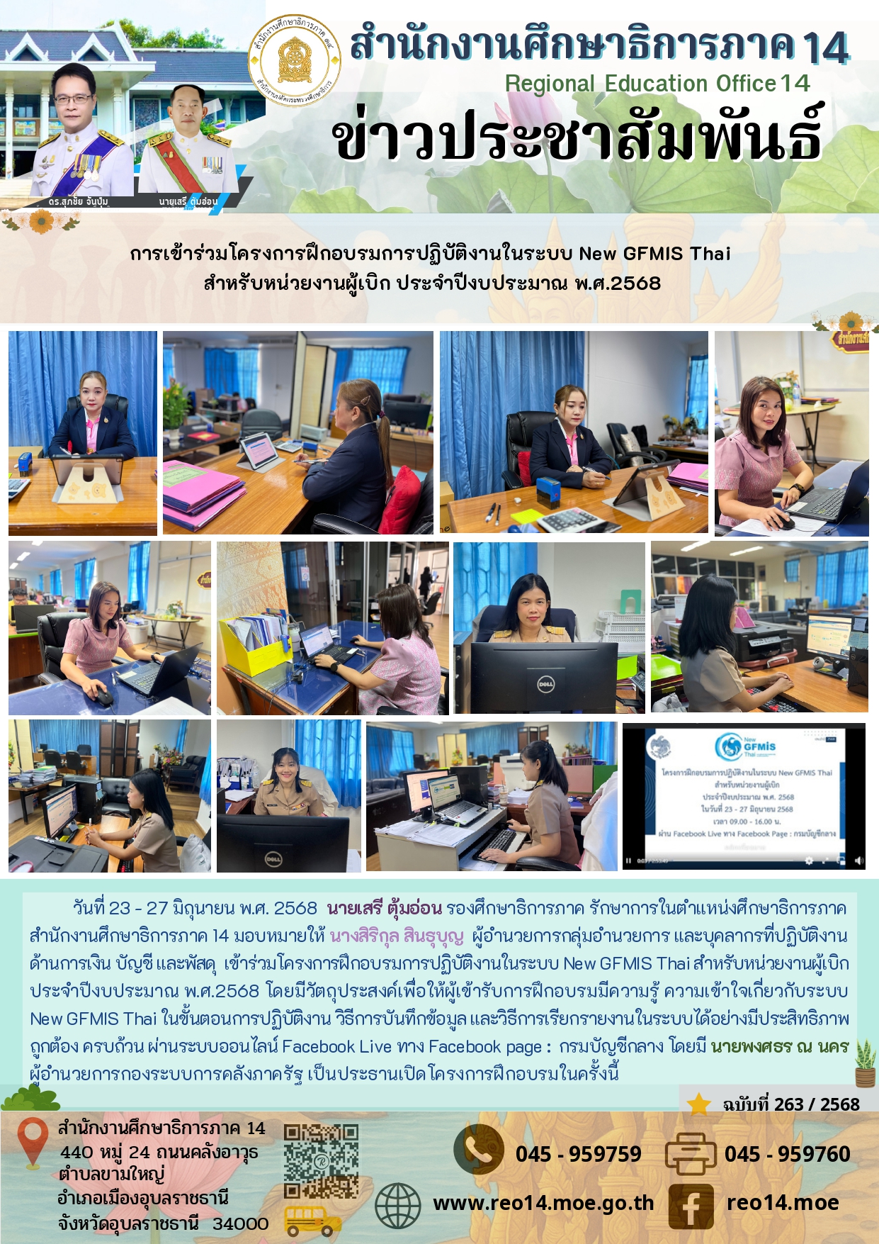 27 มิ.ย. 68 วันที่ 23 – 27 มิถุนายน พ.ศ. 2568 นายเสรี ตุ้มอ่อน รองศึกษาธิการภาค รักษาการในตำแหน่งศึกษาธิการภาค สำนักงานศึกษาธิการภาค 14 มอบหมายให้ นางสิริกุล สินธุบุญ ผู้อำนวยการกลุ่มอำนวยการ และบุคลากรที่ปฏิบัติงาน ด้านการเงิน บัญชี และพัสดุ เข้าร่วมโครงการฝึกอบรมการปฏิบัติงานในระบบ New GFMIS Thai สำหรับหน่วยงานผู้เบิก ประจำปีงบประมาณ พ.ศ.2568 โดยมีวัตถุประสงค์เพื่อให้ผู้เข้ารับการฝึกอบรมมีความรู้ ความเข้าใจเกี่ยวกับระบบ New GFMIS Thai ในขั้นตอนการปฏิบัติงาน วิธีการบันทึกข้อมูล และวิธีการเรียกรายงานในระบบได้อย่างมีประสิทธิภาพ ถูกต้อง ครบถ้วน ผ่านระบบออนไลน์ Facebook Live ทาง Facebook page : กรมบัญชีกลาง โดยมี นายพงศธร ณ นคร ผู้อำนวยการกองระบบการคลังภาครัฐ เป็นประธานเปิดโครงการฝึกอบรมในครั้งนี้