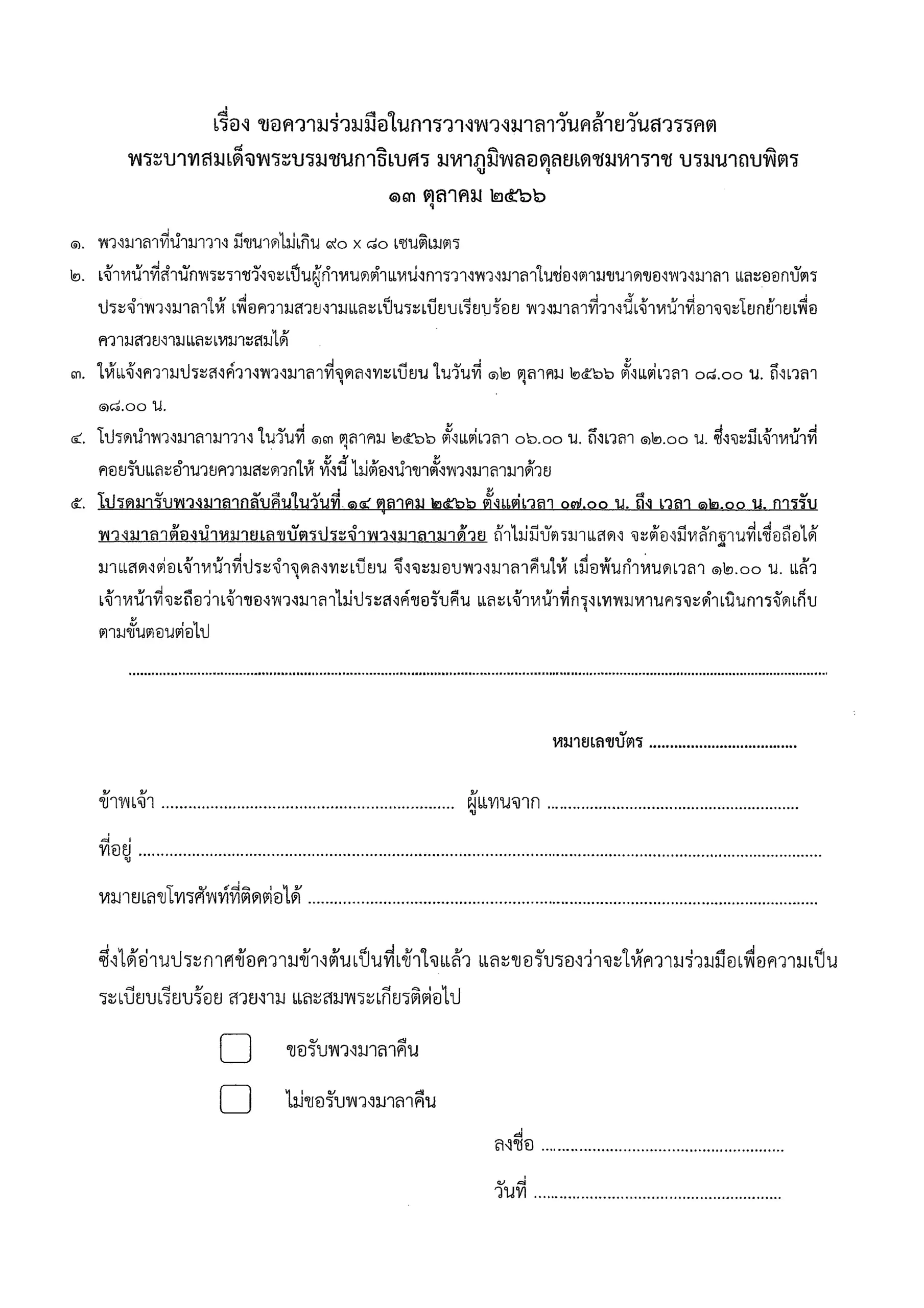 ประกาศสำนักพระราชวัง เรื่อง การวางพวงมาลาถวายบังคมพระบรมราชานุสาวรีย์พระบาทสมเด็จพระบรมชนกาธิเบศร มหาภูมิพลอดุลยเดช บรมนาถบพิตร เนื่องในวันคล้ายวันสวรรคตประจำปีพุทธศักราช 2566