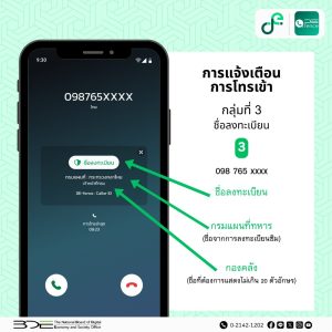 - กลุ่มที่ 3 ชื่อลงทะเบียน (สีเขียว) : เป็นเบอร์ที่ได้รับการลงทะเบียนและยืนยันตัวตนอย่างถูกต้องจากหน่วยงานต่างๆ ที่น่าเชื่อถือ เช่น หน่วยงานราชการ, สถาบันการเงิน, บริษัทประกันภัย, หรือบริษัทขนส่ง เมื่อเบอร์กลุ่มนี้โทรมา แอปจะแสดงผลเป็นป้ายสีเขียวพร้อม “ชื่อลงทะเบียน” ทำให้เรารู้ได้ทันทีว่าใครโทรมา
