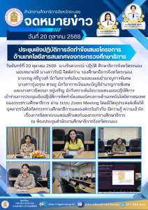 วันจันทร์ที่ 20 ตุลาคม 2568 นางรัชดาภรณ์ ปฏิบัติ ศึกษาธิการจังหวัดระนอง มอบหมายให้ นางสาวรัชนี จิตต์สว่าง รองศึกษาธิการจังหวัดระนอง นางเรณู ศรีชูวงศ์ นักวิเคราะห์นโยบายและแผนชำนาญการพิเศษ นางสาวรุ่งอรุณ ตามชู นักวิชาการเงินและบัญชีชำนาญการพิเศษ และนางสาวชิดชนก อยู่เจริญ นักวิเคราะห์นโยบายและแผนปฏิบัติการ เข้าร่วมการประชุมเชิงปฏิบัติการจัดทำข้อเสนอโครงการด้านเทคโนโลยีสารสนเทศ ของกระทรวงศึกษาธิการ ผ่าน ระบบ Zoom Meeting โดยมีวัตถุประสงค์เพื่อให้บุคลากรในสังกัดกระทรวงศึกษาธิการและองค์กรในกำกับ มีความรู้ ความเข้าใจ เรื่องการจัดหาระบบคอมพิวเตอร์ของกระทรวงศึกษาธิการ ณ ห้องประชุมสำนักงานศึกษาธิการจังหวัดระนอง