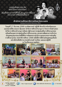 วันพุธที่ 17 ธันวาคม 2568 นางรัชดาภรณ์ ปฏิบัติ ศึกษาธิการจังหวัดระนอง มอบหมายให้นางธนภร คุ้มเพชร นักวิชาการศึกษาชำนาญการ รักษาการในตำแหน่ง นักวิชาการศึกษาชำนาญการพิเศษ (ผู้อำนวยการกลุ่มส่งเสริมการศึกษาเอกชน) พร้อมด้วยบุคลากรกลุ่มส่งเสริมการศึกษาเอกชน ออกตรวจติดตามการเบิกจ่ายเงินอุดหนุนทุกประเภทที่ได้รับการจัดสรรจากสำนักงานคณะกรรมการส่งเสริมการศึกษาเอกชน ประจำปีการศึกษา 2568 เพื่อให้การใช้จ่ายเงินอุดหนุนเป็นไปอย่างมีประสิทธิภาพ ตามหลักเกณฑ์ ระเบียบ และแนวปฏิบัติ ณ โรงเรียนอนุบาลสุพัชชา