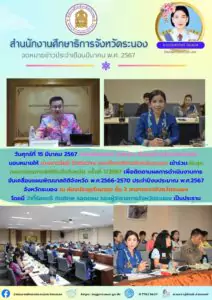 วันศุกร์ที่ 15 มีนาคม 2567 นางณันศภรณ์ นิลอรุณ ศึกษาธิการจังหวัดระนอง มอบหมายให้ นางสาวรัชนี จิตต์สว่าง รองศึกษาธิการจังหวัดระนอง เข้าร่วมประชุม คณะกรรมการสถิติระดับจังหวัด ครั้งที่ 1/2567 เพื่อติดตามผลการดำเนินงานการ ขับเคลื่อนแผนพัฒนาสถิติจังหวัด พ.ศ.2566-2570 ประจำปีงบประมาณ พ.ศ.2567 จังหวัดระนอง ณ ห้องประชุมโกมาซุม ชั้น 2 ศาลากลางจังหวัดระนอง โดยมี ว่าที่ร้อยตรี กิตติภพ รอดดอน รองผู้ว่าราชการจังหวัดระนอง เป็นประธาน