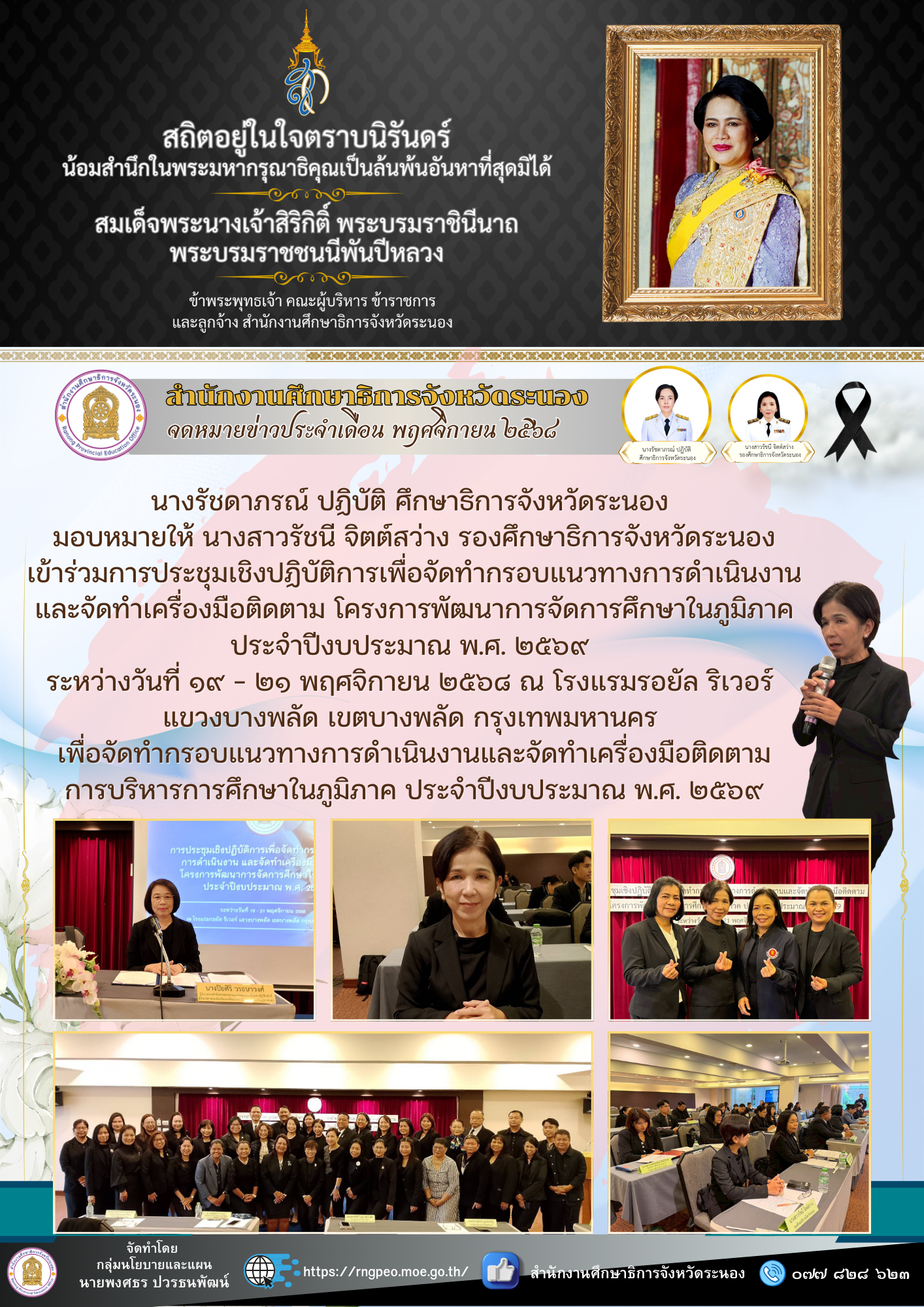 วันศุกร์ที่ 21 พฤศจิกายน 2568 นางรัชดาภรณ์ ปฏิบัติ ศึกษาธิการจังหวัดระนอง เข้าร่วมประชุม คณะกรรมการสภาการศึกษาจังหวัดระนอง ครั้งที่ 1/2568 ณ ห้องประชุมสภาองค์การบริหารส่วนจังหวัดระนอง โดยมี นายนิตย์ อุ๋ยเต็กเค่ง รองนายกองค์การบริหารส่วนจังหวัดระนอง ในฐานะประธานกรรมการ สภาการศึกษาจังหวัดระนอง เป็นประธานในการประชุม พร้อมด้วย นายราชัน มีน้อย รองผู้ว่าราชการจังหวัดระนอง ให้เกียรติมาร่วมพบปะและกล่าวต้อนรับ ดร.ชูสิน วรเดช ผู้ตรวจราชการกระทรวงศึกษาธิการ รักษาการในตำแหน่งศึกษาธิการภาค 6 การประชุมนี้จัดขึ้นเพื่อหารือแนวทางและพิจารณาวาระสำคัญในการขับเคลื่อนการจัดการศึกษาของจังหวัดระนองให้มีคุณภาพ และสอดคล้องกับบริบทของพื้นที่จังหวัดระนอง