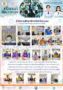 วันอังคารที่ 21 มกราคม 2568 เวลา 09:00 น. นางรัชดาภรณ์ ปฏิบัติ ศึกษาธิการจังหวัดระนอง เป็นประธานในการประชุมชี้แจงการทดสอบทางการศึกษาระดับชาติขั้นพื้นฐาน (I-NET) ปีการศึกษา 2567 ศูนย์สอบศึกษาธิการจังหวัดระนองโดยมี ข้าราชการ บุคลากรที่เกี่ยวข้อง คณะกรรมการระดับศูนย์สอบ ตัวแทนศูนย์สอบและคณะกรรมการระดับสนามสอบ เข้าประชุมเพื่อชี้แจงและสร้างความเข้าใจต่อการปฏิบัติหน้าที่ของ คณะกรรมการฯ ณ ห้องประชุมสำนักงานศึกษาธิการจังหวัดระนอง