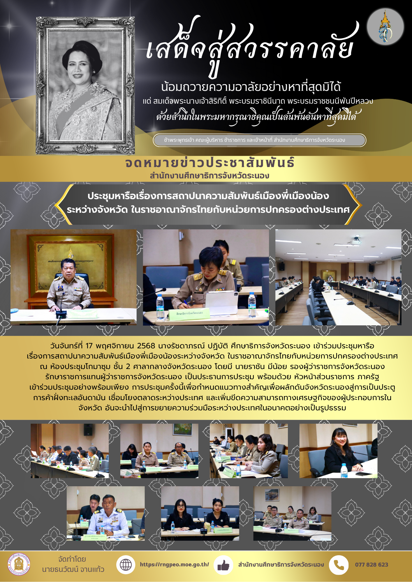 วันอาทิตย์ที่ 16 พฤศจิกายน 2568 นางรัชดาภรณ์ ปฏิบัติ ศึกษาธิการจังหวัดระนอง พร้อมด้วย นางสาวรัชนี จิตต์สว่าง รองศึกษาธิการจังหวัดระนอง และนางปัทมา มิตรกูล นักทรัพยากรบุคคลชำนาญการพิเศษ ผู้อำนวยการกลุ่มบริหารงานบุคคล เข้าร่วมรับฟังชี้แจงรายละเอียดและแนวทางการสมัครรับโครงการครูรัก(ษ์)ถิ่น รุ่นที่ 6 ปีการศึกษา 2569 ผ่านรูปแบบออนไลน์ ด้วยระบบ Zoom Meeting โดยมีวัตถุประสงค์เพื่อสร้างความเข้าใจเกี่ยวกับเกณฑ์การรับสมัคร แนวทางการคัดเลือก และบทบาทของหน่วยงานที่เกี่ยวข้องในการดำเนินโครงการ ทั้งนี้ โครงการครูรัก(ษ์)ถิ่นถือเป็นโครงการสำคัญในการผลิตและพัฒนาครูคุณภาพให้กลับไปปฏิบัติงานในถิ่นฐานบ้านเกิด เพื่อแก้ปัญหาการขาดแคลนครูในพื้นที่ห่างไกลอย่างยั่งยืน