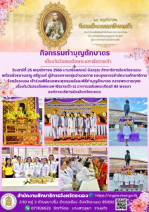 วันเสาร์ที่ 25 พฤศจิกายน 2566 นางณันศภรณ์ นิลอรุณ ศึกษาธิการจังหวัดระนอง พร้อมด้วยนางเรณู ศรีชูวงศ์ ผู้อำนวยการกลุ่มอำนวยการ และบุคลากรสำนักงานศึกษาธิการ จังหวัดระนอง เข้าร่วมพิธีสวดพระพุทธมนต์และพิธีทำบุญตักบาตร ถวายพระราชกุศล เนื่องในวันสมเด็จพระมหาธีรราชเจ้า ณ อาคารเฉลิมพระเกียรติ 80 พรรษา องค์การบริหารส่วนจังหวัดระนอง