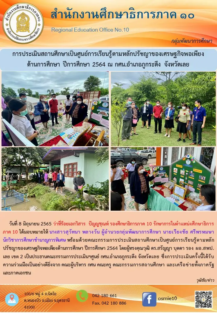 08 มิ.ย. 65 การประเมินสถานศึกษาเป็นศูนย์การเรียนรู้ตามหลักปรัชญาของเศรษฐกิจพอเพียงด้านการศึกษา ปีการศึกษา 2564 ณ กศน.อำเภอภูกระดึง จังหวัดเลย