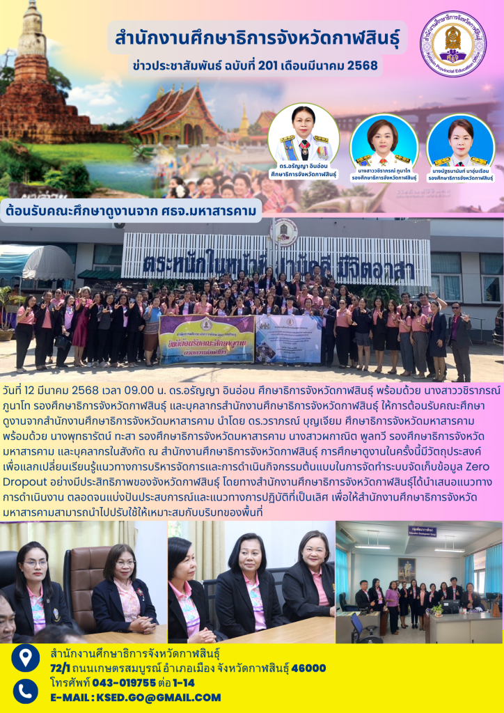 วันที่ 12 มีนาคม 2568 เวลา 09.00 น. ดร.อรัญญา อินอ่อน ศึกษาธิการจังหวัดกาฬสินธุ์ พร้อมด้วย นางสาววชิราภรณ์ ภูนาโท รองศึกษาธิการจังหวัดกาฬสินธุ์ และบุคลากรสำนักงานศึกษาธิการจังหวัดกาฬสินธุ์ ให้การต้อนรับคณะศึกษาดูงานจากสำนักงานศึกษาธิการจังหวัดมหาสารคาม นำโดย ดร.วราภรณ์ บุญเจียม ศึกษาธิการจังหวัดมหาสารคาม พร้อมด้วย นางพุทธารัตน์ ทะสา รองศึกษาธิการจังหวัดมหาสารคาม นางสาวผกาณิต พูลทวี รองศึกษาธิการจังหวัดมหาสารคาม และบุคลากรในสังกัด ณ สำนักงานศึกษาธิการจังหวัดกาฬสินธุ์