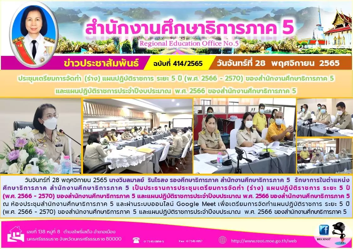 29 พ.ย. 65 สำนักงานศึกษาธิการภาค 5 ประชุมเตรียมการจัดทำ (ร่าง) แผนปฏิบัติราชการ ระยะ 5 ปี (พ.ศ. 2566 – 2570) และแผนปฏิบัติราชการประจำปีงบประมาณ พ.ศ. 2566 ของสำนักงานศึกษาธิการภาค 5