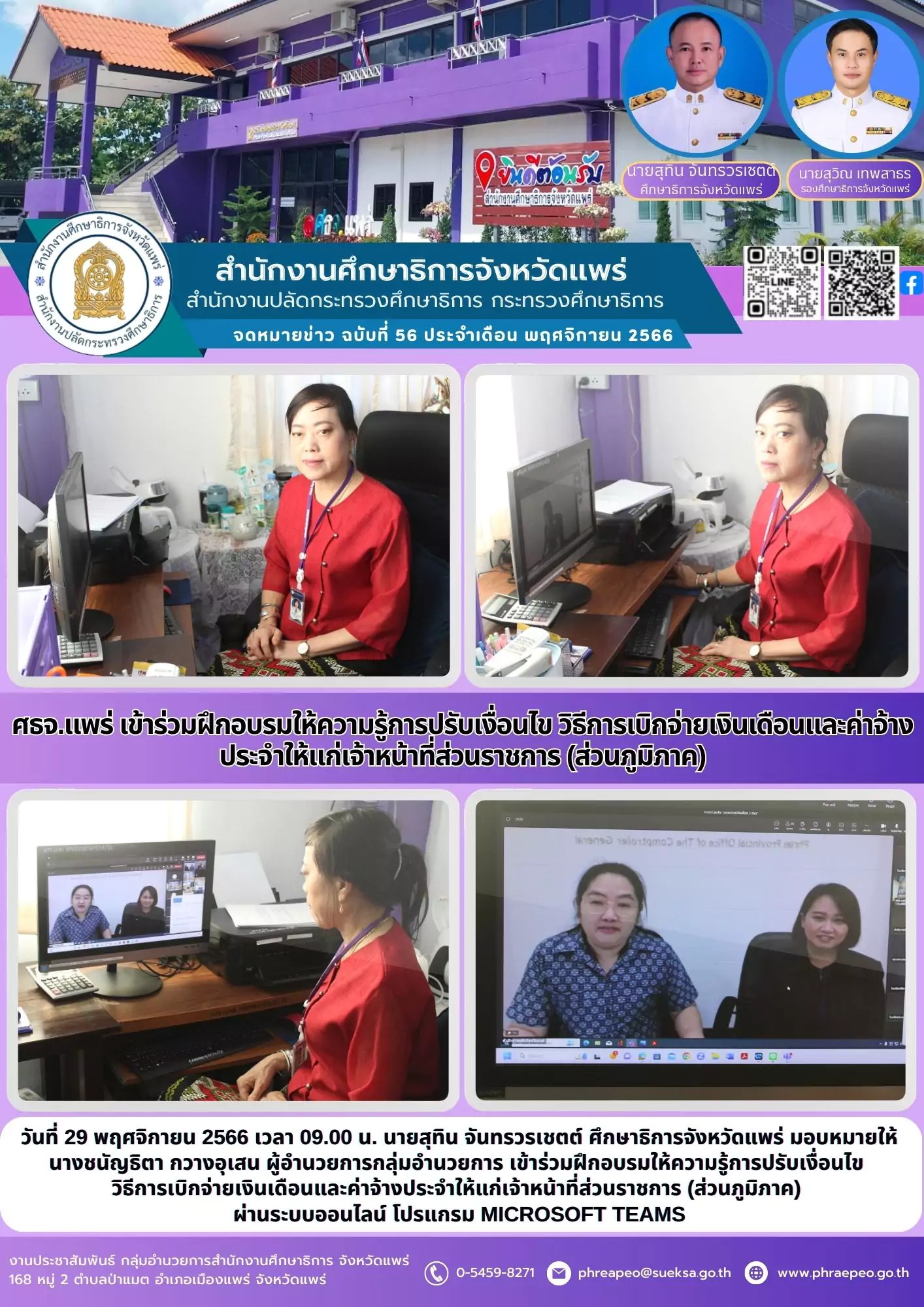 29 พ.ย. 66 ศธจ.แพร่ เข้าร่วมฝึกอบรมให้ความรู้การปรับเงื่อนไข วิธีการเบิกจ่ายเงินเดือนและค่าจ้างประจำให้แก่เจ้าหน้าที่ส่วนราชการ (ส่วนภูมิภาค)