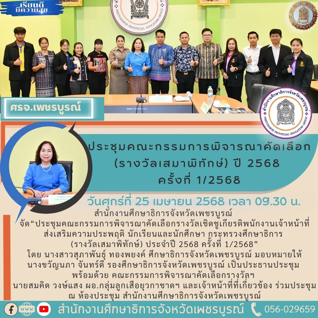 เมื่อวันที่ 12 กุมภาพันธ์ 2561 ว่าที่ ร.ต.สมชาย งามสุขสวัสดิ์ รองศึกษาธิการจังหวัดราชบุรี เป็นประธานในการประชุม การรายงานผลการตรวจราชการ ติดตามและประเมินผล การดำเนินงานตามนโยบายกระทรวงศึกษาธิการ รอบที่ 1 ประจำปี งบประมาณ 2561 เพื่อให้หน่วยงานที่เกี่ยวข้องบรรลุเป้าหมาย สอดคล้องกับยุทธศาสตร์ชาติ นโยบายรัฐบาล และนโยบายของกระทรวงศึกษาธิการ มีความโปร่งใส เป็นธรรม เป็นประโยชน์ ต่อทางราชการ มีคณะบุคลากรสำนักงานศึกษาธิการจังหวัดราชบุรี และส่วนราชการต่างๆในจังหวัดราชบุรีที่มีส่วนเกี่ยวข้องเข้าร่วมประชุม ณ ห้องประชุมราชาวดี ชั้น 3 สำนักงานศึกษาธิการภาค 4
