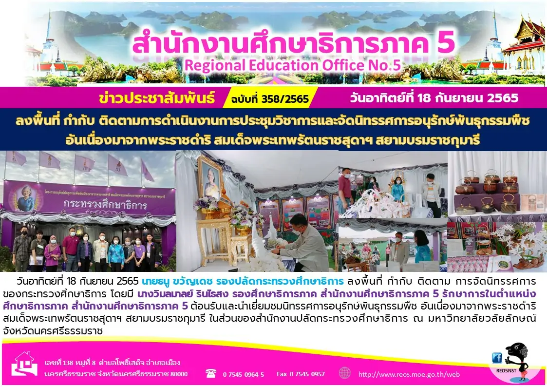 21 ก.ย. 65 นายธนู ขวัญเดช รองปลัดกระทรวงศึกษาธิการ ลงพื้นที่ กำกับ ติดตาม การจัดนิทรรศการ ของกระทรวงศึกษาธิการ ร่วมกับสำนักงานศึกษาธิการภาค 5