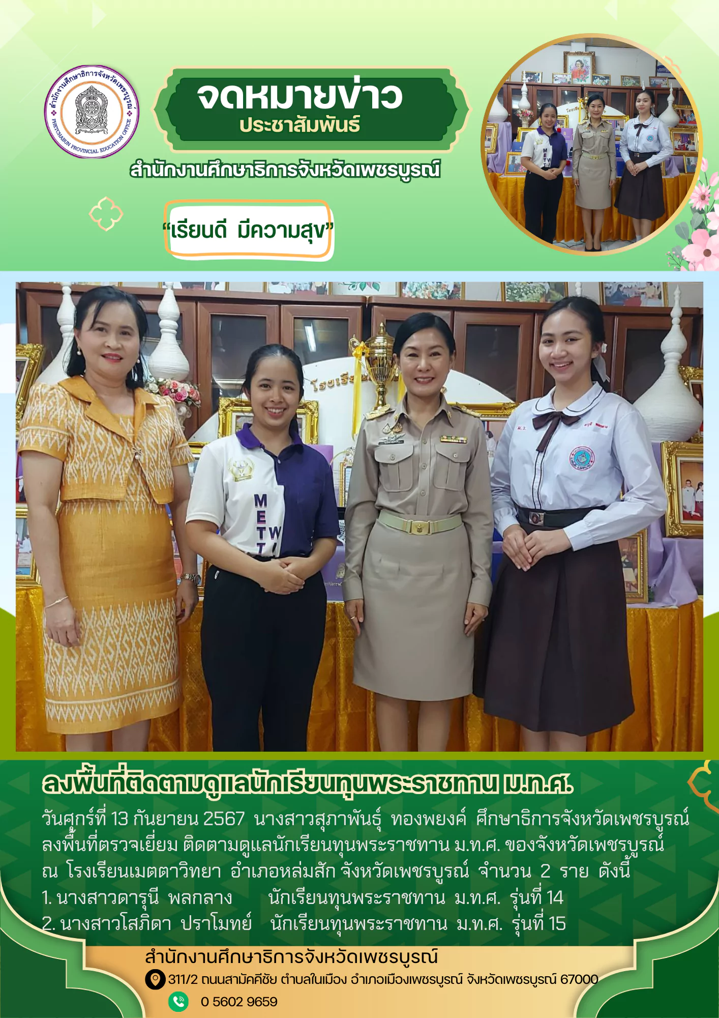 14 ก.ย. 67 (ศธจ.เพชรบูรณ์) “ลงพื้นที่ตรวจเยี่ยม ติดตามดูแลนักเรียนทุนพระราชทาน ม.ท.ศ. ของจังหวัดเพชรบูรณ์”
