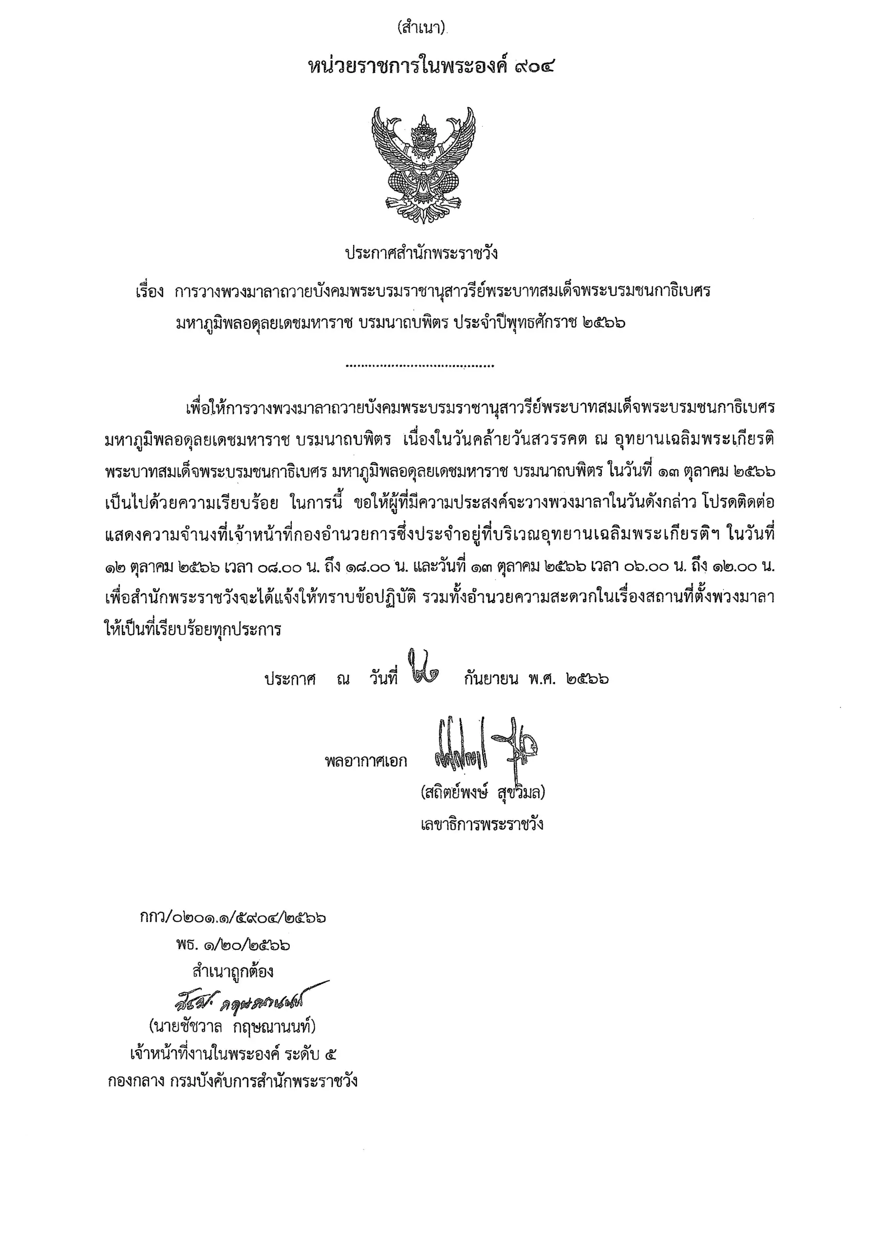 04 ต.ค. 66 ประกาศสำนักพระราชวัง เรื่อง การวางพวงมาลาถวายบังคมพระบรมราชานุสาวรีย์พระบาทสมเด็จพระบรมชนกาธิเบศร มหาภูมิพลอดุลยเดช บรมนาถบพิตร เนื่องในวันคล้ายวันสวรรคตประจำปีพุทธศักราช 2566