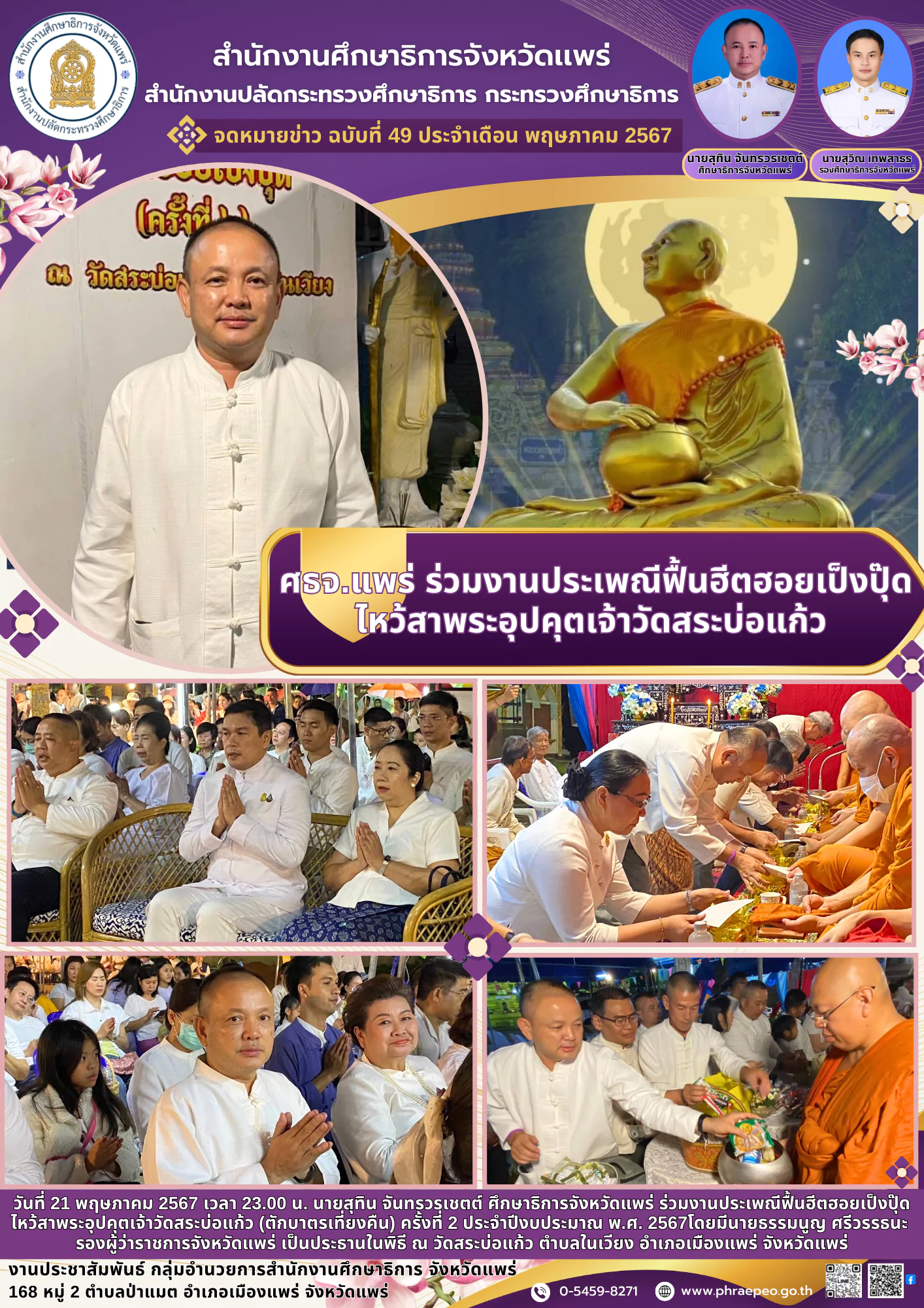 ศธจ.สิงห์บุรี ดร.สุเมธี จันทร์หอม ศึกษาธิการจังหวัดสิงห์บุรี พร้อมด้วยคณะข้าราชการในสังกัดสำนักงานศึกษาธิการจังหวัดสิงห์บุรี ร่วมพิธีทำบุญถวายเป็นพระราชกุศล และวางพานพุ่มดอกไม้ถวายราชสักการะ พร้อมกล่าวคำถวายราชสดุดี พระบาทบรมสาทิสลักษณ์พระบาทสมเด็จพระนั่ง