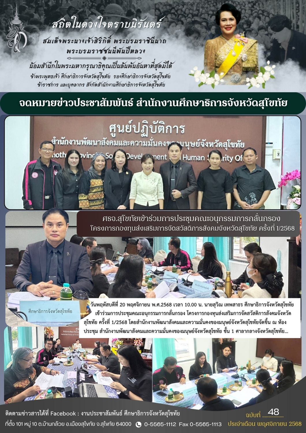 วันพฤหัสบดีที่ 20 พฤศจิกายน พ.ศ.2568 เวลา 09.30 น. นายสุวิณ เทพสาธร ศึกษาธิการจังหวัดสุโขทัย เป็นประธานคณะกรรมการพิจารณาคัดเลือกบุคคลเพื่อรับทุนโครงการ 1 อำเภอ 2 ทุน 9 จังหวัด ภาคเหนือตอนล่างเข้าศึกษาต่อระดับปริญญาตรี มหาวิทยาลัยราชภัฏพิบูลสงคราม จ.พิษณุโลก ประจำปีการศึกษา 2569 ณ ห้องประชุมสำนักงานศึกษาธิการจังหวัดสุโขทัย เพื่อเข้าศึกษาต่อในระดับอุดมศึกษา ทั้งนี้ นางปาณิสรา กระต่ายทอง รองศึกษาธิการจังหวัดสุโขทัยได้เข้าร่วมในการประชุม และคณะกรรมการฯ ผู้แทนจากหน่วยงานทางการศึกษาในจังหวัดสุโขทัย ร่วมกันพิจารณานักเรียนที่มีศักยภาพและความตั้งใจจริง ให้ได้รับโอกาสด้านทุนการศึกษาอย่างเป็นธรรม ซึ่งจังหวัดสุโขทัยได้รับโควตา 9 อำเภอ 18 ทุน แต่มีนักเรียนสมัครเข้ารับการคัดเลือกจำนวน 3 รายเท่านั้น…