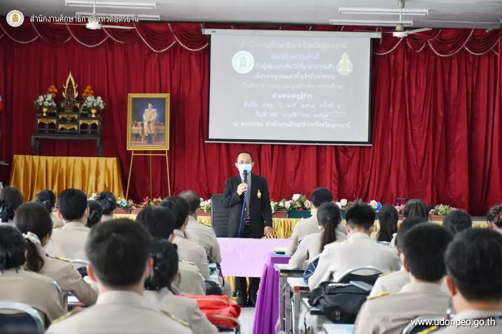 เช้านี้(25 พ.ย.65) ที่หอประชุม รร.ค่ายประจักษ์ศิลปาคม ศธจ.อุดรธานี รับรายงานตัวผู้สอบแข่งขันได้ เพื่อบรรจุและแต่งตั้งเข้ารับราชการ เป็นข้าราชการครูและบุคลากรทางการศึกษา ตำแหน่งครูผู้ช่วย สังกัด สพฐ. ปี พ.ศ.2564 ครั้งที่ 4 รวมจำนวน 106 อัตรา ประกอบด้วยเอกภาษาไทย เอกปฐมวัย เอกวิทยาศาสตร์ทั่วไป เอกสังคมศึกษา เอกพลศึกษา เอกคอมพิวเตอร์ เอกนาฏศิลป์ โอกาสนี้ นายสุวัฒน์ชัย แสนราช ศึกษาธิการจังหวัดอุดรธานี พร้อมด้วยนายวัชรพงศ์ พิพัฒน์สุริยวงศ์, นายสมชาย ดอนสมพงษ์ รองศึกษาธิการจังหวัดอุดรธานี ได้พบปะ แสดงความยินดีแก่ครูผู้ช่วยบรรจุใหม่ พร้อมให้ข้อคิดในการทำงาน โดยเฉพาะการวางตัวให้เหมาะสม พร้อมได้ฝากให้ครูผู้ช่วยทุกคนได้ทราบและน้อมนำพระบรมราชโชบายด้านการศึกษา รัชกาลที่ 10 มาปฏิบัติ กล่าวคือ การศึกษาต้องมุ่งสร้างพื้นฐานให้แก่ผู้เรียน 4 ด้าน ได้แก่ 1. มีทัศนคติที่ถูกต้องต่อบ้านเมือง 2. มีพื้นฐานชีวิตที่มั่นคง มีคุณธรรม 3. มีงานทำ มีอาชีพ และ 4. เป็นพลเมืองดี