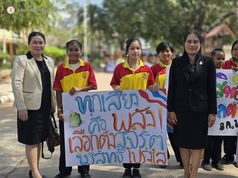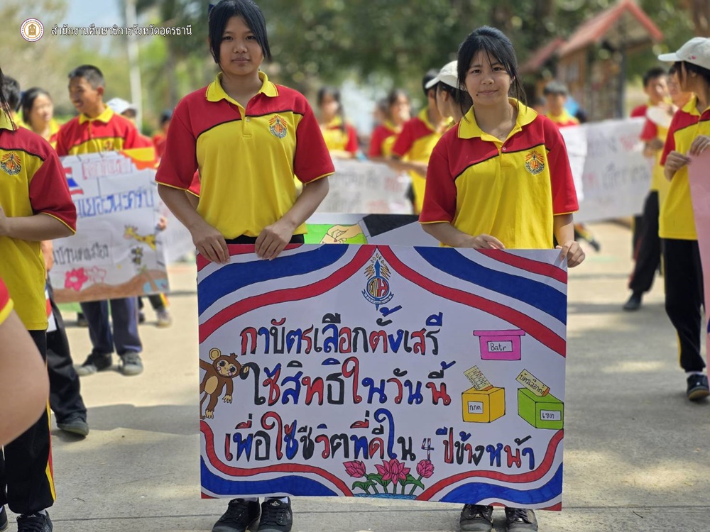 ที่ รร.บ้านดงเมือง อ.กุมภวาปี สพป.อุดรธานี เขต 2 วันที่ 5 ก.พ.69 เวลา 13.00น. นายเฉลิมชัย แสนมหาชัย ศึกษาธิการจังหวัดอุดรธานี มอบหมายให้นางผ่องศรี ทับทิมทอง รองศึกษาธิการจังหวัดอุดรธานี พร้อมด้วยคณะกรรมการ ลงพื้นที่กำกับ ติดตาม และให้กำลังใจการจัดกิจกรรมรณรงค์ประชาธิปไตยในสถานศึกษา ซึ่งโรงเรียนบ้านดงเมืองได้จัดกิจกรรมเดินพาเหรด ถือป้ายรณรงค์เชิญชวนออกไปใช้สิทธิ์เลือกตั้ง พร้อมถ่ายทอดสาระความรู้เกี่ยวกับกระบวนการเลือกตั้งอย่างสร้างสรรค์ บรรยากาศเต็มไปด้วยรอยยิ้ม ความคึกคัก และความภาคภูมิใจของนักเรียน ครู และบุคลากรทางการศึกษา ที่ได้ร่วมเป็นส่วนหนึ่งในการปลูกฝังจิตสำนึกความเป็นพลเมืองดี และร่วมขับเคลื่อนประชาธิปไตยให้เติบโตอย่างมีคุณภาพตั้งแต่ระดับฐานราก ทั้งนี้ กระทรวงศึกษาธิการได้บูรณาการความร่วมมือกับสำนักงานคณะกรรมการการเลือกตั้ง และสถานศึกษาทั่วประเทศ เพื่อเสริมสร้างความรู้ ความเข้าใจเกี่ยวกับการปกครองในระบอบประชาธิปไตยอันมีพระมหากษัตริย์ทรงเป็นประมุข ให้นักเรียน นักศึกษาสามารถนำความรู้ไปถ่ายทอดสู่ครอบครัวและชุมชน ตระหนักถึงความสำคัญของการเลือกตั้ง และร่วมกันออกไปใช้สิทธิ์เลือกตั้งสมาชิกสภาผู้แทนราษฎร ในวันที่ 8 ก.พ.นี้ อย่างพร้อมเพรียง เสียงเล็ก ๆ จากห้องเรียนวันนี้ คือพลังสำคัญของประชาธิปไตยไทยในวันข้างหน้า