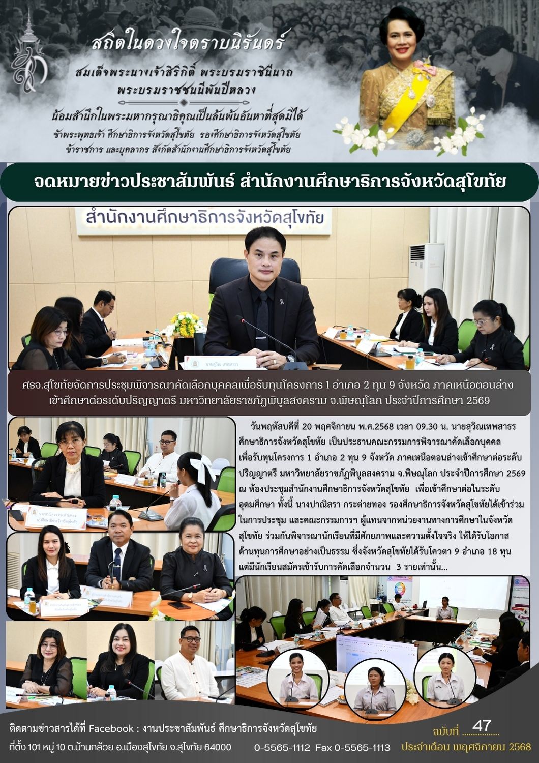 วันพฤหัสบดีที่ 20 พฤศจิกายน 2568 เวลา 09.00 น. นางสาวสุภาพันธุ์ ทองพยงค์ ศึกษาธิการจังหวัดเพชรบูรณ์ กรรมการ สกสค. จังหวัด รักษาการแทน ผู้อำนวยการสำนักงาน สกสค. จังหวัดเพชรบูรณ์ เป็นประธาน“ประชุมเชิงปฏิบัติการผู้แทนครูและบุคลากรทางการศึกษาในประจำการและนอกประจำการ 77 จังหวัด ครั้งที่ 1/2568 (ผ่านระบบ Zoom Meeting)” โดยมี ผู้แทนครูและบุคลากรทางการศึกษาจังหวัดเพชรบูรณ์ และเจ้าหน้าที่ที่เกี่ยวข้อง เข้าร่วมประชุม เพื่อชี้แจงแนวทางทางการดำเนินงานด้านสวัสดิการ/ด้านสวัสดิภาพ/ยกย่องเชิดชูเกียรติและส่งเสริมความสามัคคี ให้สอดคล้องกับแนวทางและนโยบายด้านการศึกษา ณ ห้องประชุมสำนักงาน สกสค. จังหวัดเพชรบูรณ์