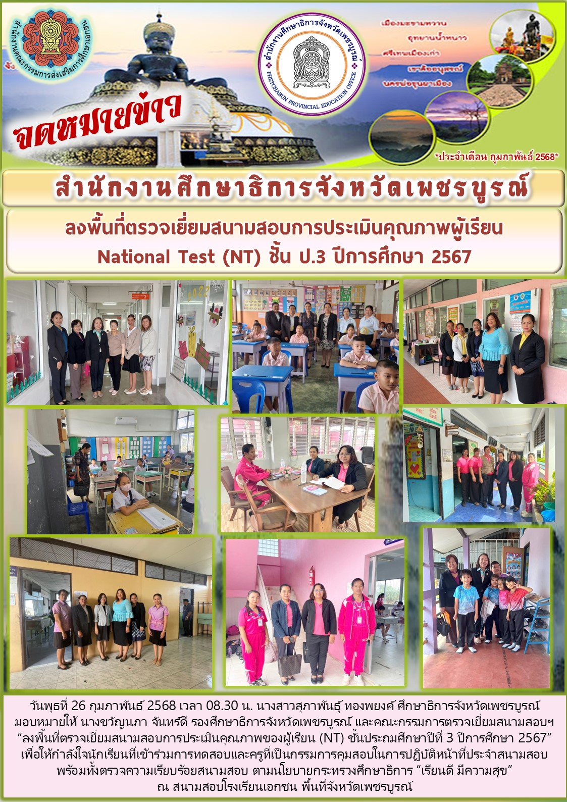 (ศธจ.เพชรบูรณ์) “ลงพื้นที่ตรวจเยี่ยมสนามสอบการประเมินคุณภาพของผู้เรียน (NT) ชั้นประถมศึกษาปีที่ 3 ปีการศึกษา 2567”