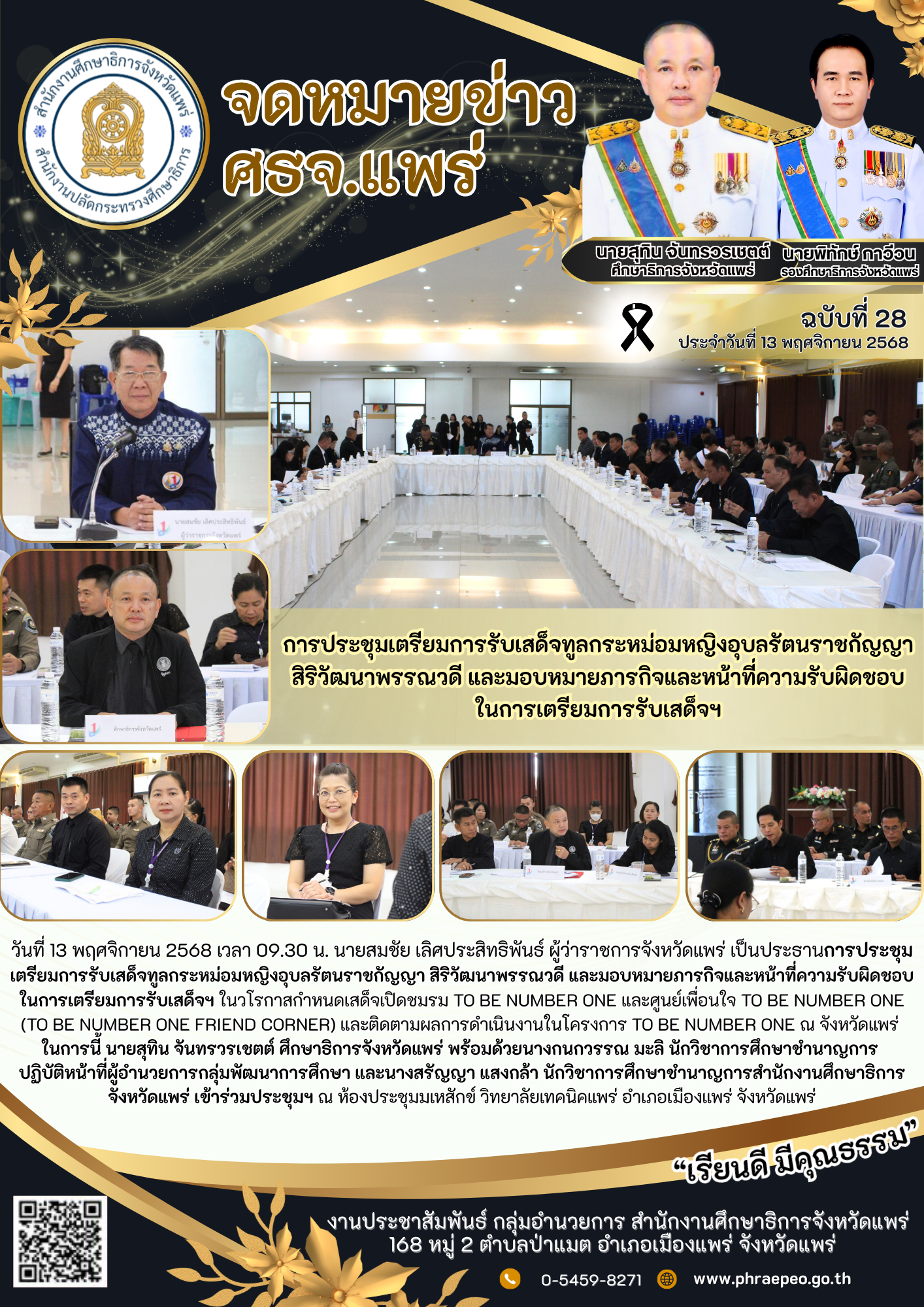 13 พ.ย. 68 การประชุมเตรียมการรับเสด็จทูลกระหม่อมหญิงอุบลรัตนราชกัญญา สิริวัฒนาพรรณวดี และมอบหมายภารกิจและหน้าที่ความรับผิดชอบในการเตรียมการรับเสด็จฯ