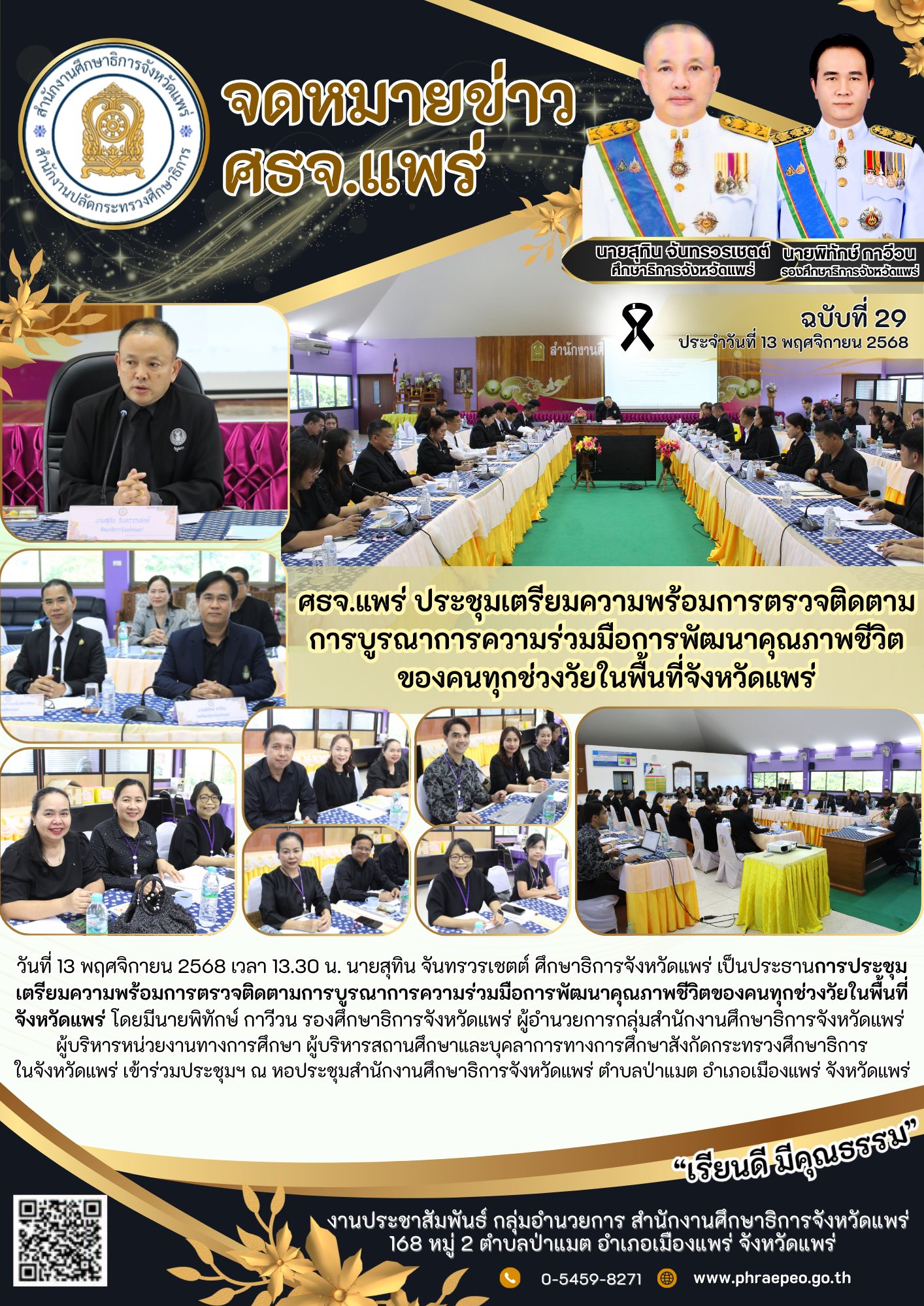 13 พ.ย. 68 ศธจ.แพร่ ประชุมเตรียมความพร้อมการตรวจติดตามการบูรณาการความร่วมมือการพัฒนาคุณภาพชีวิตของคนทุกช่วงวัยในพื้นที่จังหวัดแพร่