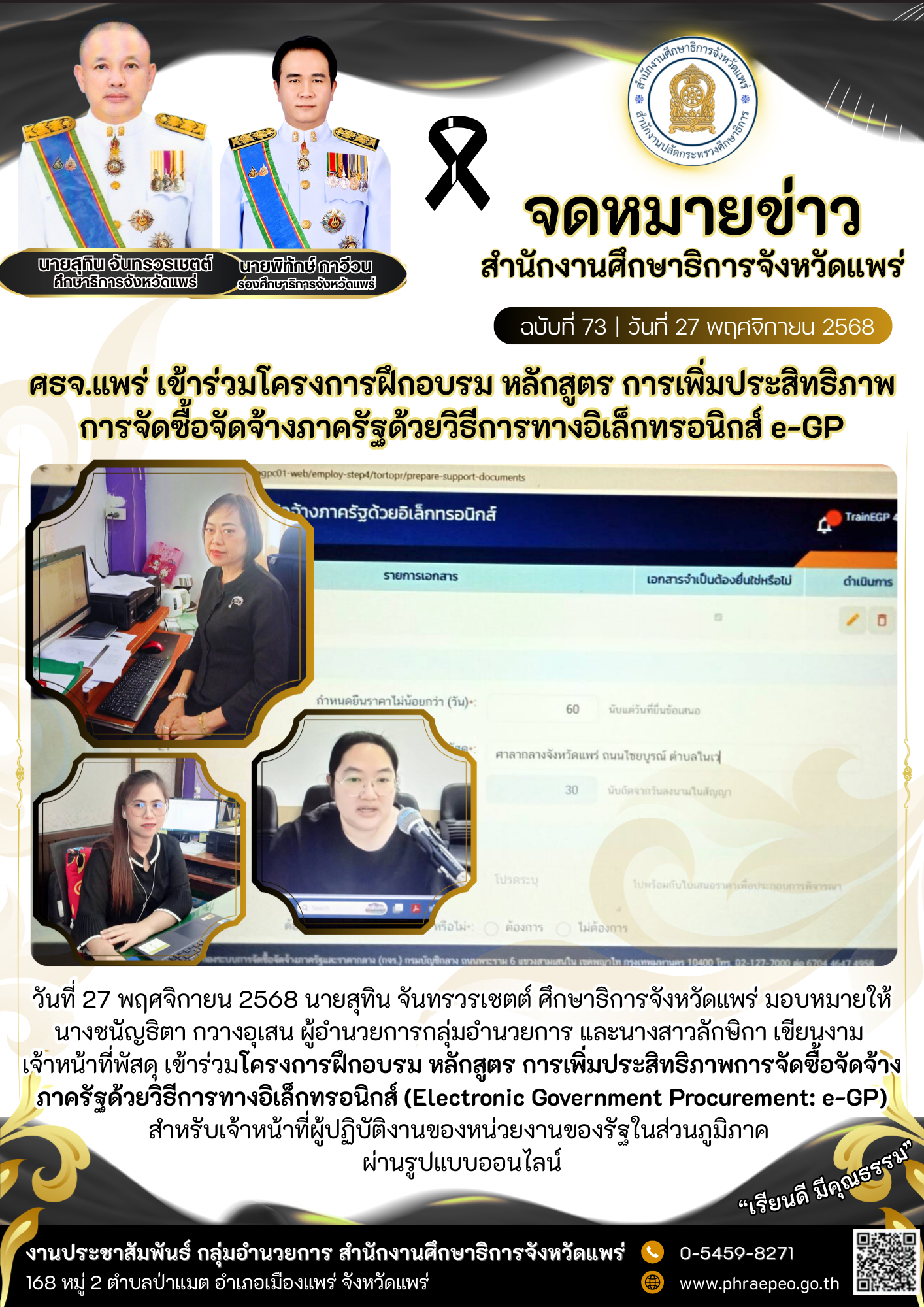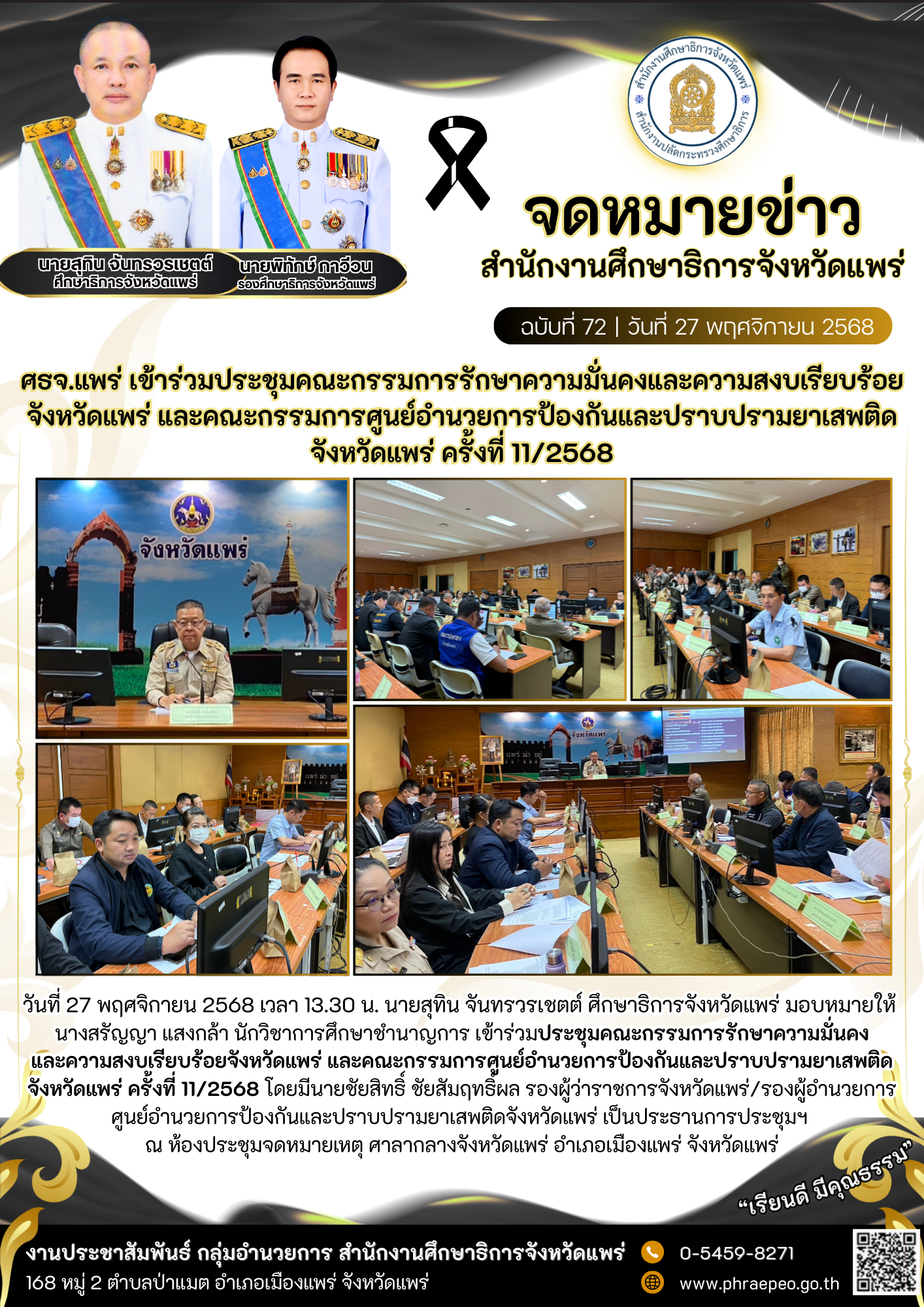 วันที่ 27 พฤศจิกายน 2568 เวลา 10.00 น. นายสุทิน จันทรวรเชตต์ ศึกษาธิการจังหวัดแพร่ เข้าร่วมประชุมคณะกรมการจังหวัดแพร่ หัวหน้าส่วนราชการ และหน่วยงานที่เกี่ยวข้อง ครั้งที่ 11/2568 โดยมีนายสมชัย เลิศประสิทธิพันธ์ ผู้ว่าราชการจังหวัดแพร่ เป็นประธานการประชุมฯ ณ ห้องประชุมจดหมายเหตุ ศาลากลางจังหวัดแพร่ ตำบลในเวียง อำเภอเมืองแพร่ จังหวัดแพร่