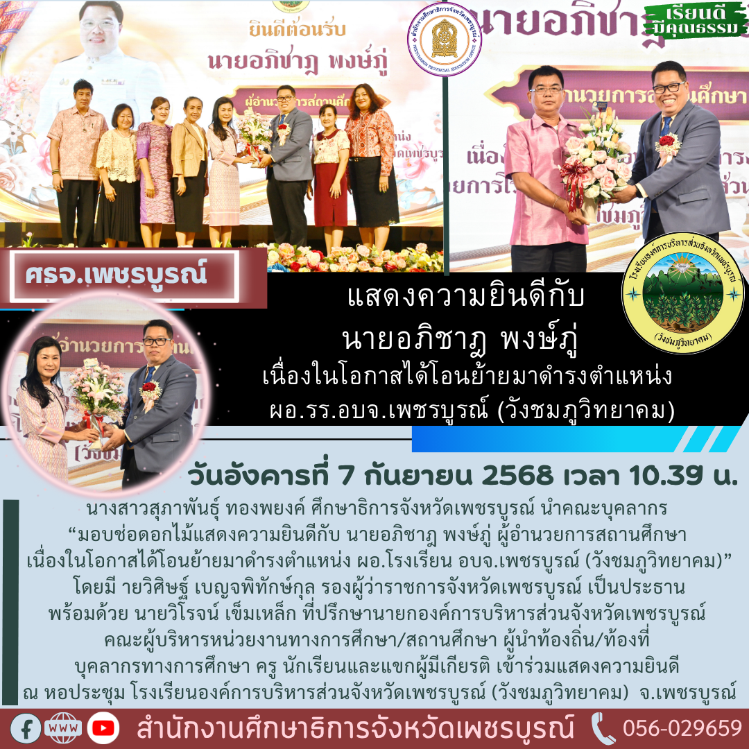 07 ต.ค. 68 (ศธจ.เพชรบูรณ์) ร่วม“แสดงความยินดีกับ นายอภิชาฎ พงษ์ภู่ เนื่องในโอกาสได้โอนย้ายมาดำรงตำแหน่ง ผอ.รร.อบจ.เพชรบูรณ์ (วังชมภูวิทยาคม)”