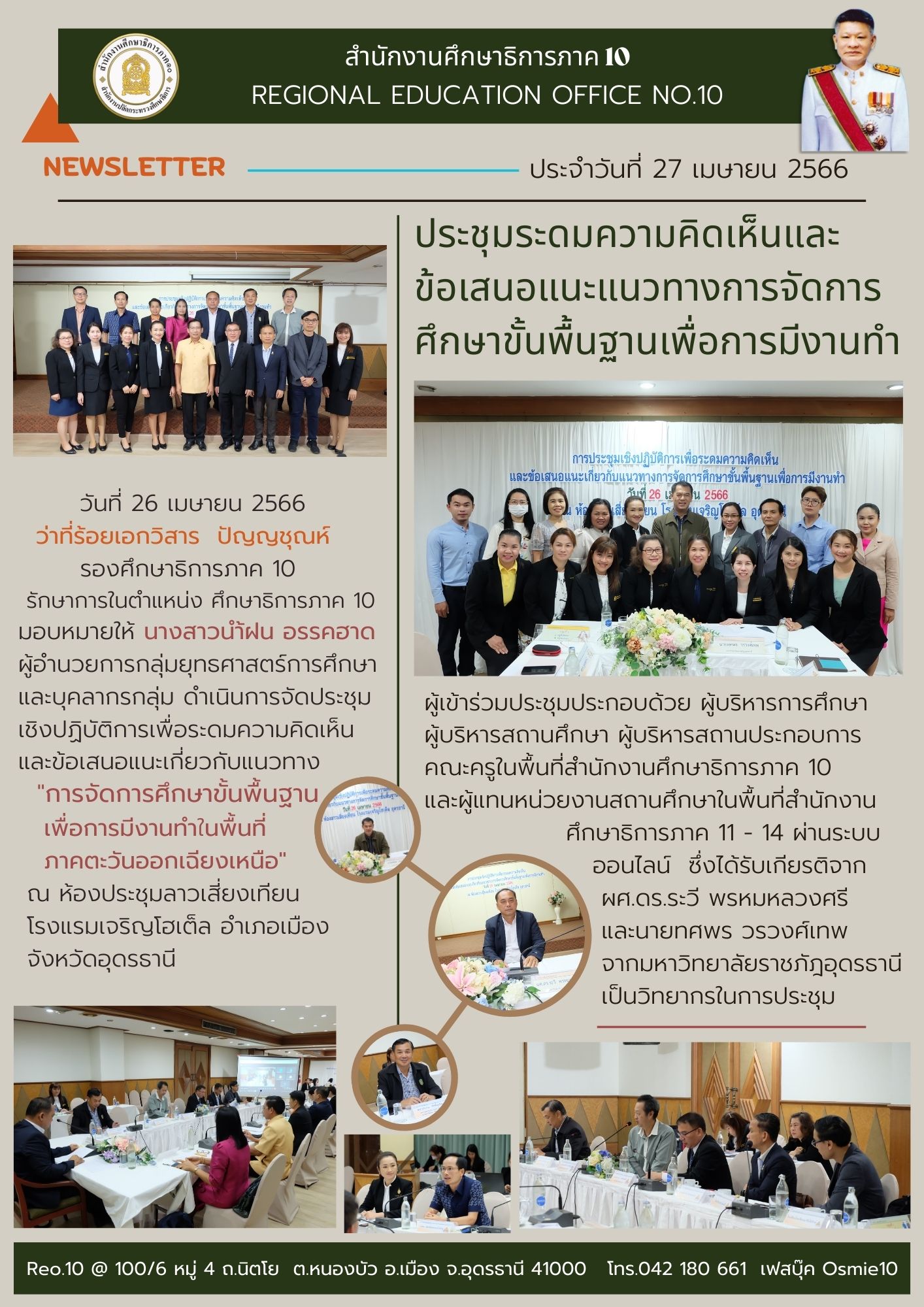 วันที่ 26 เมษายน 2566 ว่าที่ร้อยเอก วิสาร ปัญญชุณห์ รองศึกษาธิการภาค 10 รักษาการในตำแหน่งศึกษาธิการภาค 10 มอบหมายให้นางสาวน้ำฝน อรรคฮาด ผู้อำนวยการกลุ่มยุทธศาสตร์การศึกษา และบุคลากรกลุ่ม ดำเนินการจัดประชุมเชิงปฏิบัติการเพื่อระดมความคิดเห็นและข้อเสนอแนะเกี่ยวกับแนวทางการจัดการศึกษาขั้นพื้นฐานเพื่อการมีงานทำในพื้นที่ภาคตะวันออกเฉียงเหนือ ซึ่งได้รับเกียรติจาก ผศ.ดร.ระวี พรหมหลวงศรี และนายทศพร วรวงศ์เทพ เป็นวิทยากรในการประชุม ณ ห้องประชุมลาวเสี่ยงเทียน โรงแรมเจริญโฮเต็ล อำเภอเมือง จังหวัดอุดรธานี