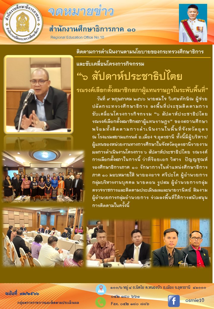 วันที่ 9 พ.ค. 2566 นายสมใจ วิเศษทักษิณ ผู้ช่วยปลัดกระทรวงศึกษาธิการ ลงพื้นที่ประชุมติดตามการขับเคลื่อนโครงการกิจกรรม “6 สัปดาห์ประชาธิปไตย รณรงค์เลือกตั้งสมาชิกสภาผู้แทนราษฎร” ของหน่วยงาน/สถานศึกษา ในพื้นที่จังหวัดอุดรธานี ณ โรงแกรมสยามแกรนด์ อ.เมือง จ.อุดรธานี ทั้งนี้มีผู้บริหาร/ผู้แทนของหน่วยงานทางการศึกษาในจังหวัดอุดรธานีรายงานผลการดำเนินงานการรณรงค์การเลือกตั้งสมาชิกสภาผู้แทนราษฎร รวมทั้งปัญหา/อุปสรรค และข้อเสนอแนะแนวททางแก้ไข