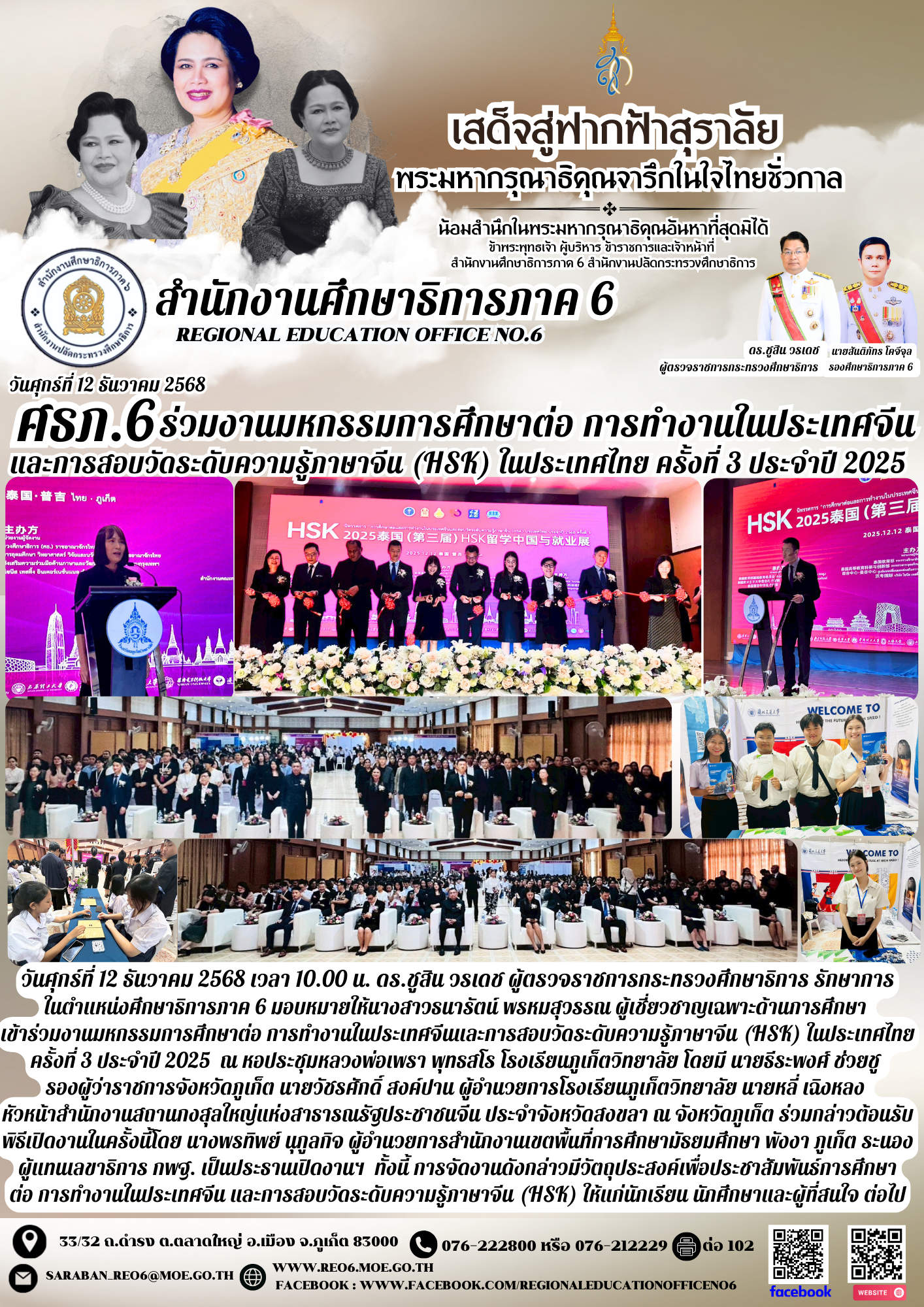 วันศุกร์ที่ 12 ธันวาคม 2568 เวลา 10.00 น. ดร.ชูสิน วรเดช ผู้ตรวจราชการกระทรวงศึกษาธิการ รักษาการในตำแหน่งศึกษาธิการภาค 6 มอบหมายให้นางสาวธนารัตน์ พรหมสุวรรณ ผู้เชี่ยวชาญเฉพาะด้านการศึกษา เข้าร่วมงานมหกรรมการศึกษาต่อ การทํางานในประเทศจีนและการสอบวัดระดับความรู้ภาษาจีน (HSK) ในประเทศไทย ครั้งที่ 3 ประจําปี 2025 ณ หอประชุมหลวงพ่อเพรา พุทธสโร โรงเรียนภูเก็ตวิทยาลัย โดยมี นายธีระพงศ์ ช่วยชู รองผู้ว่าราชการจังหวัดภูเก็ต นายวัชรศักดิ์ สงค์ปาน ผู้อำนวยการโรงเรียนภูเก็ตวิทยาลัย นายหลี่ เฉิงหลง หัวหน้าสํานักงานสถานกงสุลใหญ่แห่งสาธารณรัฐประชาชนจีน ประจําจังหวัดสงขลา ณ จังหวัดภูเก็ต ร่วมกล่าวต้อนรับ พิธีเปิดงานในครั้งนี้โดย นางพรทิพย์ นุกูลกิจ ผู้อำนวยการสำนักงานเขตพื้นที่การศึกษามัธยมศึกษา พังงา ภูเก็ต ระนอง ผู้แทนเลขาธิการ กพฐ. เป็นประธานเปิดงานฯ ทั้งนี้ การจัดงานดังกล่าวมีวัตถุประสงค์เพื่อประชาสัมพันธ์การศึกษาต่อ การทํางานในประเทศจีน และการสอบวัดระดับความรู้ภาษาจีน (HSK) ให้แก่นักเรียน นักศึกษาและผู้ที่สนใจ ต่อไป