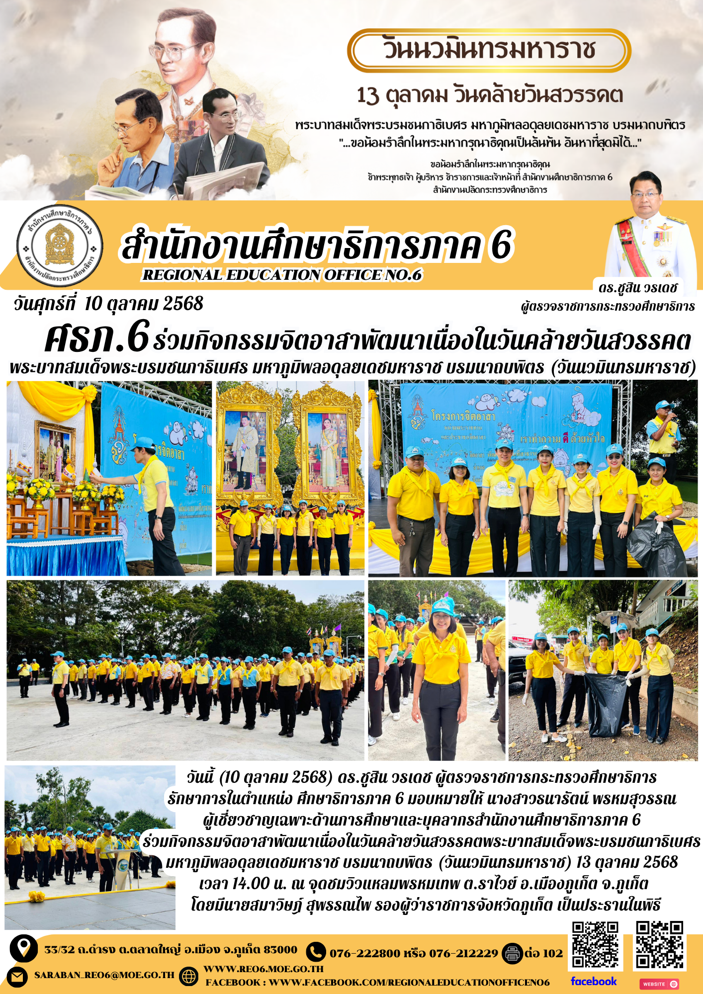 วันจันทร์ที่ 13 ตุลาคม 2568 เวลา 07.30 น. ดร.ชูสิน วรเดช ผู้ตรวจราชการกระทรวงศึกษาธิการ รักษาการในตำแหน่งศึกษาธิการภาค 6 มอบหมายให้นางสาวธนารัตน์ พรหมสุวรรณ ผู้เชี่ยวชาญเฉพาะด้านการศึกษา พร้อมด้วยบุคลากร ศธภ.6 เข้าร่วมพิธีเจริญพระพุทธมนต์และพิธีวางพวงมาลาถวายราชสักการะ ณ ศาลากลางจังหวัดภูเก็ต เนื่องในวันคล้ายวันสวรรคต พระบาทสมเด็จพระบรมชนกาธิเบศร มหาภูมิพลอดุลยเดชมหาราช บรมนาถบพิตร โดยมี นายศรัณย์ศักด์ ศรีเครือเนตร ผู้ว่าราชการจังหวัดภูเก็ตเป็นประธานในพิธี