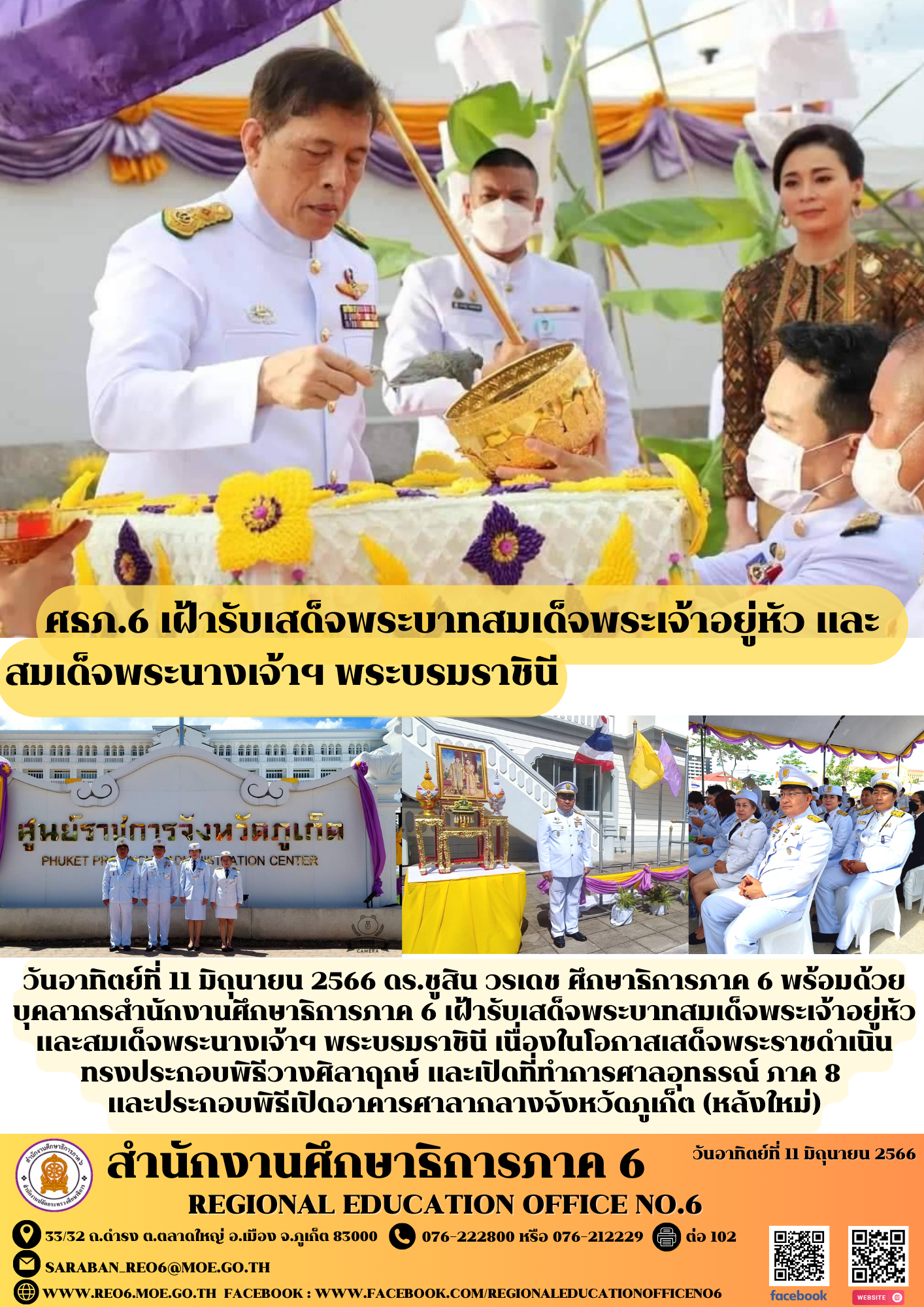 วันอาทิตย์ที่ 11 มิถุนายน 2566 ดร.ชูสิน วรเดช ศึกษาธิการภาค 6 พร้อมด้วยบุคลากรสำนักงานศึกษาธิการภาค 6 เฝ้ารับเสด็จพระบาทสมเด็จพระเจ้าอยู่หัวและสมเด็จพระนางเจ้าฯ พระบรมราชินี เนื่องในโอกาสเสด็จพระราชดำเนินทรงประกอบพิธีวางศิลาฤกษ์ และเปิดที่ทำการศาลอุทธรณ์ ภาค 8 และประกอบพิธีเปิดอาคารศาลากลางจังหวัดภูเก็ต (หลังใหม่)