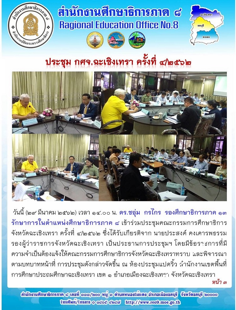 เมื่อวันที่ 29 มีนาคม 2562 เวลา 14.00 น. ดร.ชอุ่ม  กรไกร  รองศึกษาธิการภาค 13 รักษาการในตำแหน่งศึกษาธิการภาค 8 เข้าร่วมประชุมคณะกรรมการศึกษาธิการจังหวัดฉะเชิงเทรา ครั้งที่ 4/2562 ซึ่งได้รับเกียรติจาก นายประสงค์ คงเคารพธรรม   รองผู้ว่าราชการจังหวัดฉะเชิงเทรา เป็นประธานการประชุมฯ โดยมีข้อราชการที่มีความจำเป็นต้องแจ้งให้คณะกรรมการศึกษาธิการจังหวัดฉะเชิงเทราทราบ และพิจารณาตามบทบาทหน้าที่ การประชุมดังกล่าวจัดขึ้น ณ ห้องประชุมแปดริ้ว สำนักงานเขตพื้นที่การศึกษาประถมศึกษาฉะเชิงเทรา เขต 1 อำเภอเมืองฉะเชิงเทรา จังหวัดฉะเชิงเทรา
