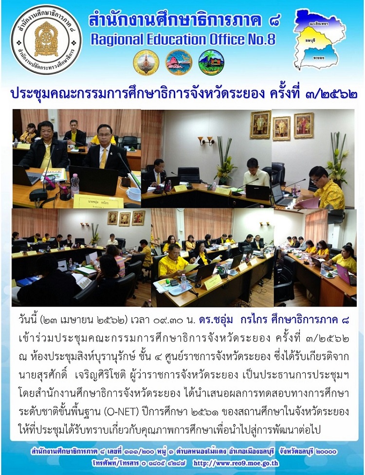ศธภ.8 ดร.ชอุ่ม กรไกร ศึกษาธิการภาค 8 เข้าร่วมประชุมคณะกรรมการศึกษาธิการจังหวัดระยอง ครั้งที่ 3/2562