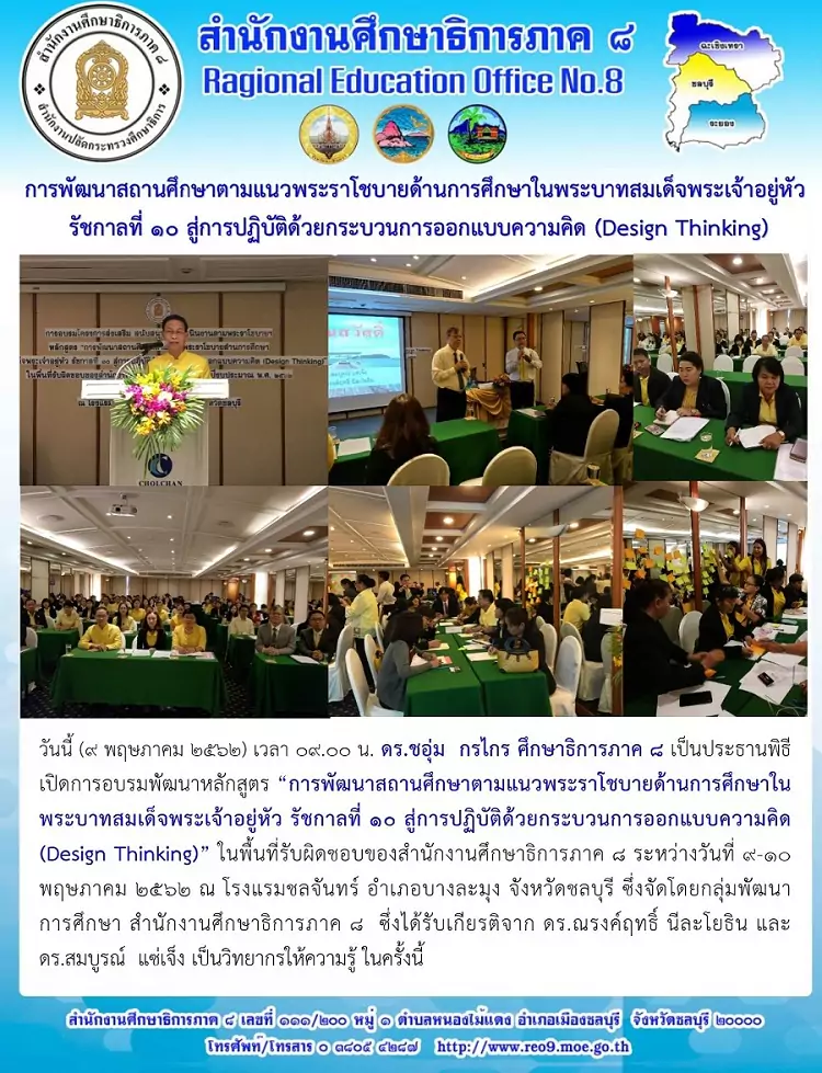 วันนี้ (9 พฤษภาคม 2562) เวลา 09.00 น. ดร.ชอุ่ม กรไกร ศึกษาธิการภาค 8 เป็นประธานพิธีเปิดการอบรมพัฒนาหลักสูตร “การพัฒนาสถานศึกษาตามแนวพระราโชบายด้านการศึกษาในพระบาทสมเด็จพระเจ้าอยู่หัว รัชกาลที่ 10 สู่การปฏิบัติด้วยกระบวนการออกแบบความคิด (Design Thinking)” ในพื้นที่รับผิดชอบของสำนักงานศึกษาธิการภาค 8 ระหว่างวันที่ 9-10 พฤษภาคม 256 ณ โรงแรมชลจันทร์ อำเภอบางละมุง จังหวัดชลบุรี ซึ่งจัดโดยกลุ่มพัฒนาการศึกษา สำนักงานศึกษาธิการภาค 8 ซึ่งได้รับเกียรติจาก ดร.ณรงค์ฤทธิ์ นีละโยธิน และ ดร.สมบูรณ์ แซ่เจ็ง เป็นวิทยากรให้ความรู้ ในครั้งนี้