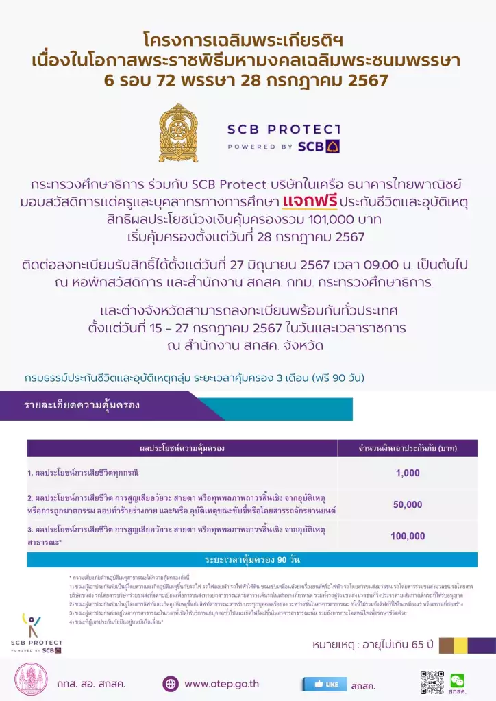 รมว.ศธ. กล่าวว่า กระทรวงศึกษาธิการได้รับความอนุเคราะห์จาก SCB Protect ในการจัดโครงการเฉลิมพระเกียรติฯเนื่องในโอกาสพระราชพิธีมหามงคลเฉลิมพระชนมพรรษา 6 รอบ 72 พรรษา 28 กรกฎาคม 2567 เพียงลงทะเบียนผ่าน QR Code โดยไม่มีค่าใช้จ่ายในการดำเนินการ ครูและบุคลากรทางการศึกษา ที่ทำหน้าที่ในการดูแลผู้เรียนของเรา ก็จะได้สิทธิประโยชน์ประกันอุบัติเหตุและประกันชีวิตฟรี และคาดว่าโครงการนี้จะเป็นประโยชน์กับครูทั่วประเทศ