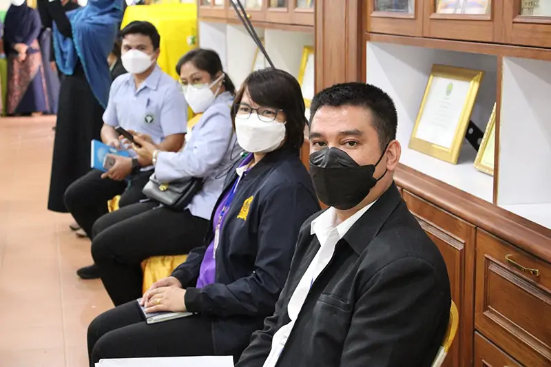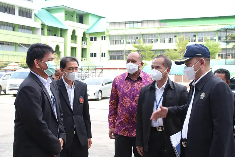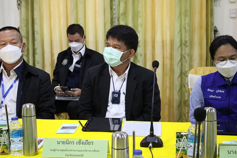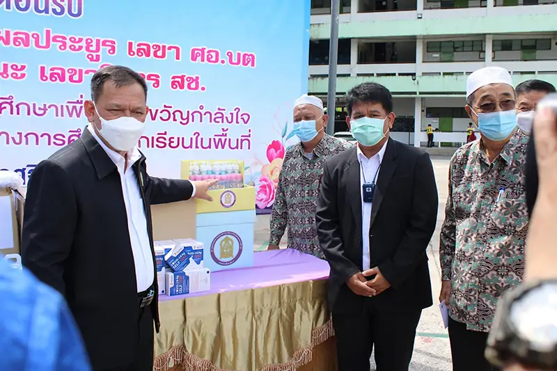 วันที่ 17 พฤศจิกายน 2564 ศูนย์ประสานงานและบริหารการศึกษาจังหวัดชายแดนภาคใต้ ร่วมลงพื้นที่กับศูนย์อำนวยการบริหารจังหวัดชายแดนภาคใต้ (ศอ.บต.) ในการตรวจเยี่ยมสถานศึกษาเพื่อเตรียมการเปิดภาคเรียน (On Site) ในพื้นที่จังหวัดชายแดนภาคใต้ โดยดร.วาทิต มีสนุ่น ผู้อำนวยการศูนย์ประสานงานและบริหารการศึกษาจังหวัดชายแดนภาคใต้ มอบหมายให้นายนิกร เซ้งเถียร รองผู้อำนวยการ ศปบ.จชต. พร้อมด้วยบุคลากร ศปบ.จชต. ร่วมลงพื้นที่ตรวจเยี่ยมสถานศึกษาและการเตรียมความพร้อมในการฉีดวัคซีนในพื้นที่ โดยมี พลเรือตรี สมเกียรติ ผลประยูร เลขาธิการ ศูนย์อำนวยการบริหารจังหวัดชายแดนภาคใต้ (ศอ.บต.) เป็นประธานในการประชุมฯ และลงพื้นที่ตรวจเยี่ยมสถานศึกษา เพื่อสร้างขวัญกำลังใจแก่คณะผู้บริหาร ครู บุคลากรทางการศึกษา นักเรียนในพื้นที่ เตรียมความพร้อมในการฉีดวัคซีน และเปิดภาคเรียน (On Site) ทั้ง 3 โรงเรียนในพื้นที่จังหวัดชายแดนภาคใต้ คือ โรงเรียนธรรมวิทยามูลนิธิ ตำบลสะเตง อำเอภเมือง จังหวัดยะลา โรงเรียนจงรักสัตย์วิทยา ตำบลตันหยงลุโละ อำเภอเมืองปัตตานี จังหวัดปัตตานี และโรงเรียนอัตตัรกียะห์อิสลามิยะห์ ตำบลบางนาค อำเภอเมือง จังหวัดนราธิวาส ในสังกัดสำนักงานคณะกรรมการส่งเสริมการศึกษาเอกชน โดยทั้ง 3 โรงเรียน ได้รายงานสรุปภาพรวมความก้าวหน้าในการเตรียมความพร้อมสำหรับการเปิดภาคเรียน (On Site) พร้อมรับฟังข้อเสนอแนะแนวทางการทำงานของส่วนราชการต่างๆในพื้นที่จังหวัดชายแดนภาคใต้ ทั้งนี้ ศูนย์ประสานงานและบริหารการศึกษาจังหวัดชายแดนภาคใต้ ร่วมมอบเจลแอลกอฮอล์ อุปกรณ์ป้องกันการแพร่ระบาดของโรคโควิด 19 ให้กับผู้บริหาร ครู บุคลากรทางการศึกษา ทั้ง 3 โรงเรียน
