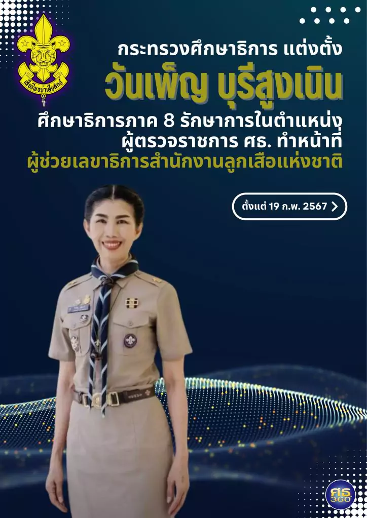 ก่อนหน้านี้ มีคำสั่งกระทรวงศึกษาธิการ ที่ สลช. 107/2567 เรื่อง แต่งตั้งผู้บริหารระดับสูงในกระทรวงศึกษาธิการ ทำหน้าที่ผู้ช่วยเลขาธิการสำนักงานลูกเสือแห่งชาติ โดยแต่งตั้ง นางสาววันเพ็ญ บุรีสูงเนิน ศึกษาธิการภาค สำนักงานศึกษาธิการภาค 8 รักษาการในตำแหน่งผู้ตรวจราชการกระทรวงศึกษาธิการ ทำหน้าที่ผู้ช่วยเลขาธิการสำนักงานลูกเสือแห่งชาติ อีกหน้าที่หนึ่ง