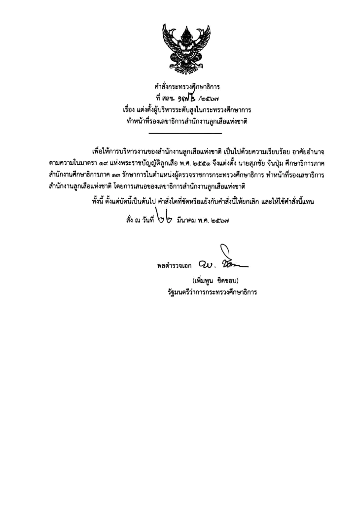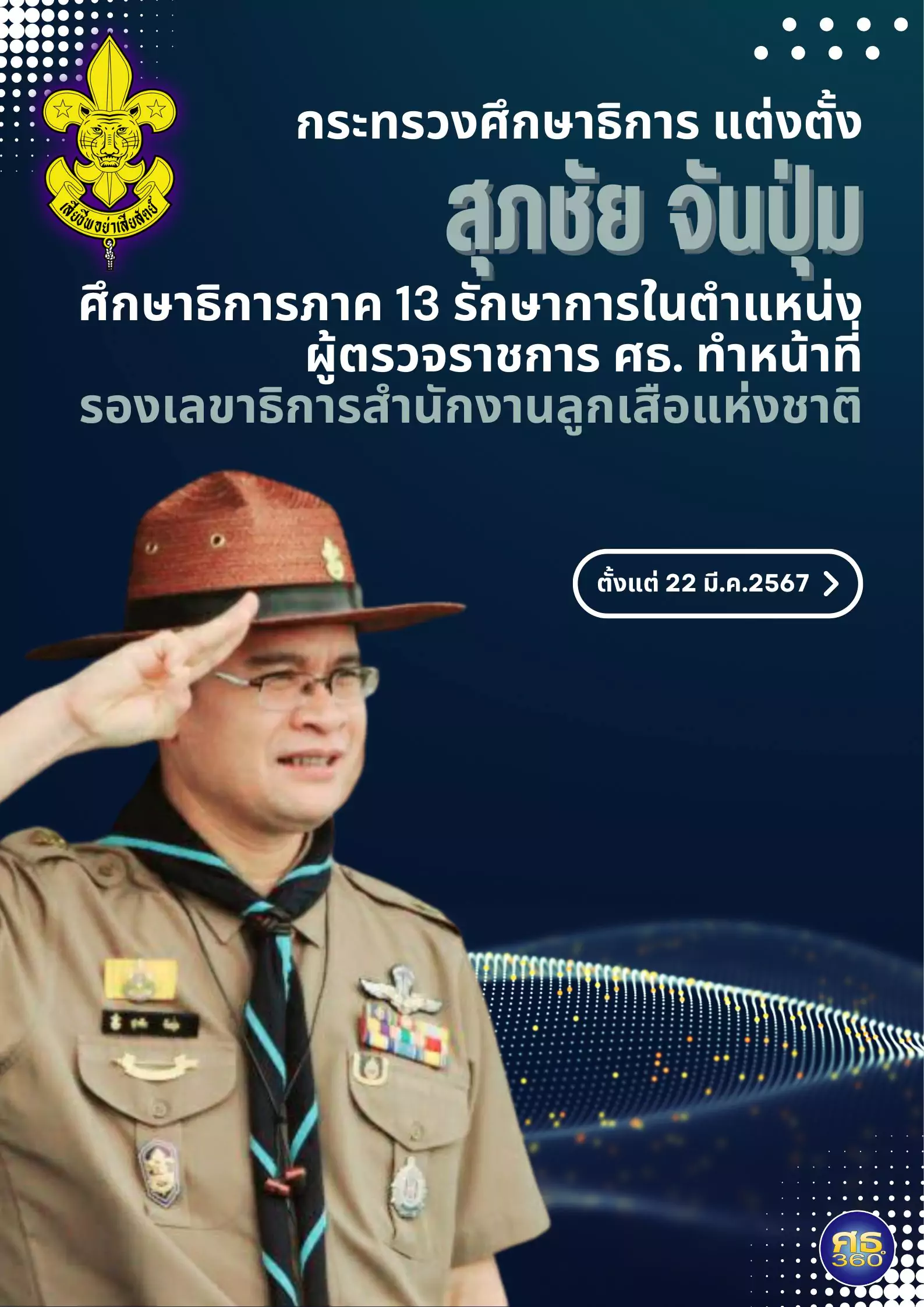 และคำสั่งกระทรวงศึกษาธิการ ที่ สลช. 175/2567 สั่ง ณ วันที่ 22 มีนาคม พ.ศ. 2567 เรื่อง แต่งตั้งผู้บริหารระดับสูงในกระทรวงศึกษาธิการ ทำหน้าที่รองเลขาธิการสำนักงานลูกเสือแห่งชาติ โดยแต่งตั้ง นายสุภชัย จันปุ่ม ศึกษาธิการภาค สำนักงานศึกษาธิการภาค 13 รักษาการในตำแหน่งผู้ตรวจราชการกระทรวงศึกษาธิการ ทำหน้าที่รองเลขาธิการสำนักงานลูกเสือแห่งชาติ โดยการเสนอของเลขาธิการสำนักงานลูกเสือแห่งชาติ