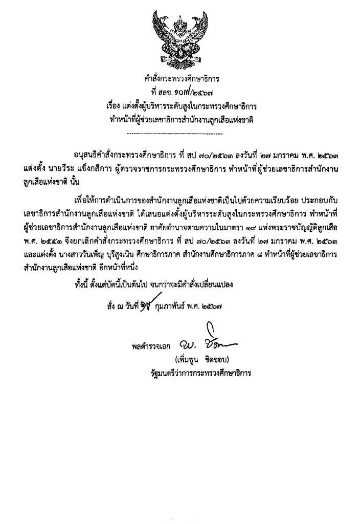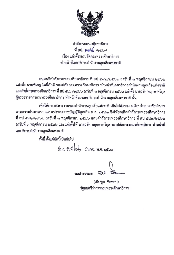 พลตำรวจเอก เพิ่มพูน ชิดชอบ รัฐมนตรีว่าการกระทรวงศึกษาธิการ ลงนามในคำสั่งกระทรวงศึกษาธิการ ที่ สป. 174/2567 สั่ง ณ วันที่ 22 มีนาคม พ.ศ. 2567 เรื่อง แต่งตั้งรองปลัดกระทรวงศึกษาธิการ ทำหน้าที่เลขาธิการสำนักงานลูกเสือแห่งชาติ โดยแต่งตั้งให้ นายวรัท พฤกษาทวีกุล รองปลัดกระทรวงศึกษาธิการ ทำหน้าที่เลขาธิการสำนักงานลูกเสือแห่งชาติ
