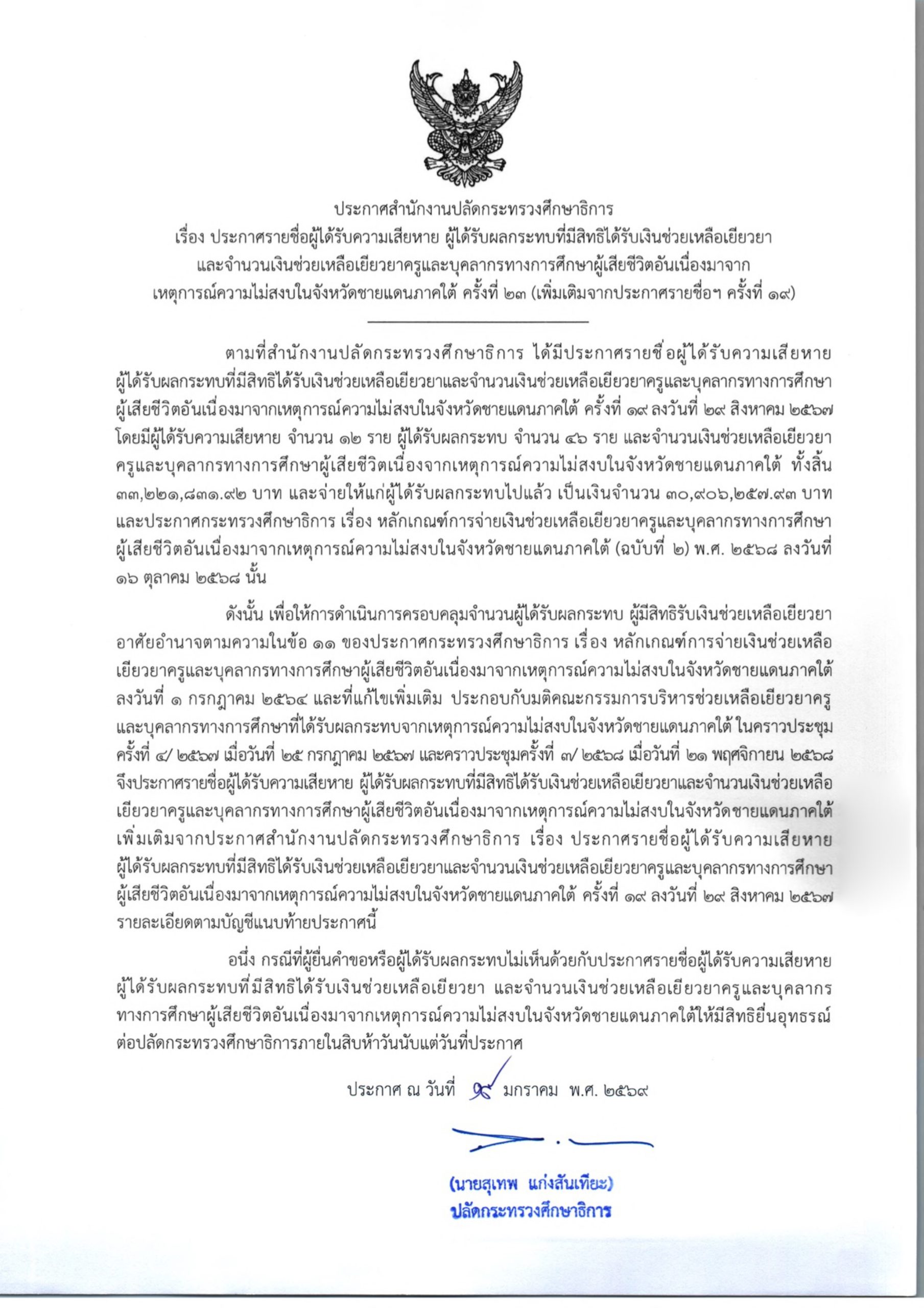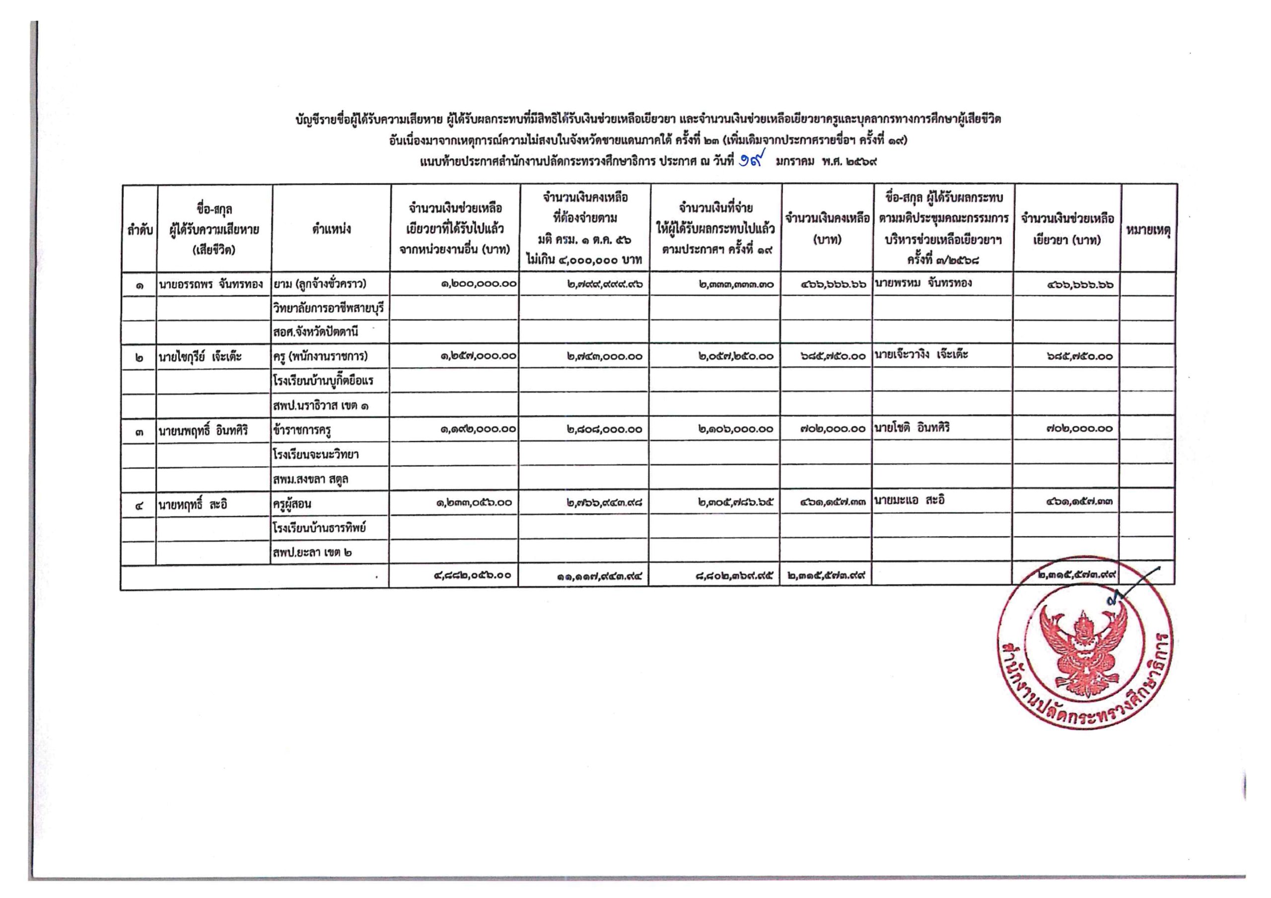 สำนักงานปลัดกระทรวงศึกษาธิการ โดยศูนย์ขับเคลื่อนการศึกษาในจังหวัดชายแดนภาคใต้ ประกาศรายชื่อผู้ได้รับความเสียหาย ผู้ได้รับผลกระทบที่มีสิทธิได้รับเงินช่วยเหลือเยียวยาและจำนวนเงินช่วยเหลือเยียวยาครูและบุคลากรทางการศึกษาผู้เสียชีวิตอันเนื่องมาจากเหตุการณ์ความไม่สงบ ในจังหวัดชายแดนภาคใต้ ครั้งที่ 23 (เพิ่มเติมจากประกาศรายชื่อฯ ครั้งที่ 19)