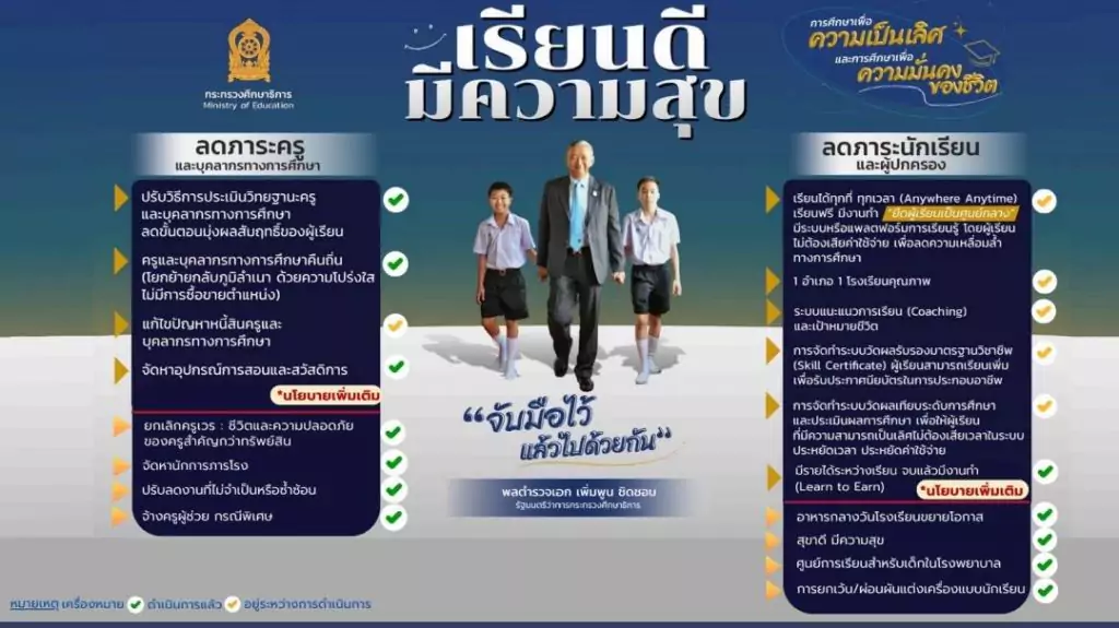 รมว.ศธ. กล่าวในการพิจารณาร่างพระราชบัญญัติงบประมาณรายจ่ายประจำปีงบประมาณ พ.ศ. 2568 (วาระที่ 1 ขั้นรับหลักการ) ว่า กระทรวงศึกษาธิการ (ศธ.) มีนโยบาย “เรียนดี มีความสุข” โดยแบ่งการศึกษาออกเป็น 2 ฝั่ง คือ การศึกษาเพื่อความเป็นเลิศ และการศึกษาเพื่อความมั่นคงของชีวิต ซึ่งเป้าหมายหลักในการจะมีความสุขได้ก็คือการลดภาระครูและบุคลากรทางการศึกษา รวมถึงลดภาระของนักเรียนและผู้ปกครอง ทั้งนี้จากนโยบายที่ได้เคยแถลงไปและดำเนินการไปแล้ว ศธ. ยังมีการดำเนินการนโยบายเพิ่มเติมที่น่าสนใจ เช่น การยกเลิกครูเวร การจัดจ้างนักการภารโรง การปรับลดภาระงานที่ไม่จำเป็นหรือซ้ำซ้อน ดำเนินการจ้างครูผู้ช่วยเป็นกรณีพิเศษ เป็นต้น ส่วนทางด้านนักเรียน ศธ.ได้นำเสนอคณะรัฐมนตรี (ครม.) ซึ่งได้รับมติเห็นชอบในการจัดหาอาหารกลางวันให้กับโรงเรียนขยายโอกาส รวมทั้งเห็นชอบและอนุมัติเรื่องศูนย์การเรียนสำหรับเด็กในโรงพยาบาล โดย ศธ.ได้จัดทำคำของบประมาณมาในร่าง พ.ร.บ.รายจ่ายประจำปี พ.ศ.2568 นี้ด้วยเช่นกัน