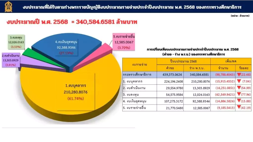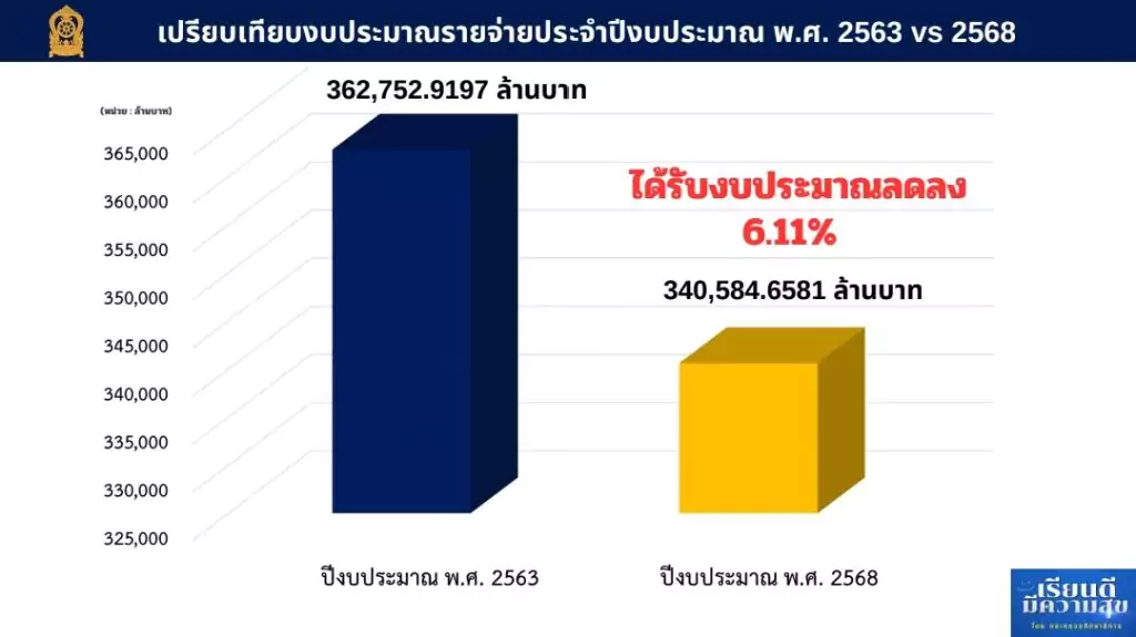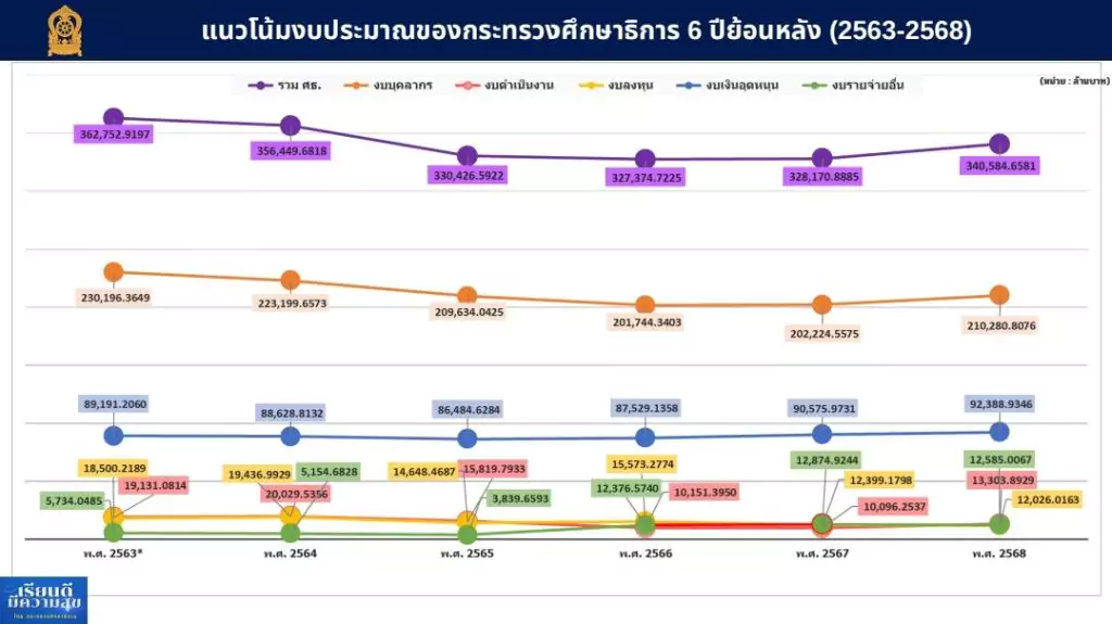 รมว.ศธ. กล่าวอีกว่า ภาพรวมงบประมาณของ ศธ. ย้อนหลัง 6 ปี (2563-2568) เห็นได้ว่าปี 2563 งบประมาณจะได้สูง จากนั้นแนวโน้มต่ำลงมาเรื่อย ๆ จนกระทั่ง ปี 2567 จึงได้รับการพิจารณางบประมาณสูงขึ้น และในคำของบประมาณรายจ่ายประจำปี 2568 รัฐบาลก็ได้ให้ความสำคัญกับการศึกษา มีการปรับงบประมาณเพิ่มสูงขึ้นมากกว่าปีที่แล้ว แต่อย่างไรก็ตามหากเทียบจากปี 2568 กับปี 2563 ยังคงลดลงคิดเป็นร้อยละ 6.11 ขณะที่โครงสร้างงบประมาณปี 2568 จำนวน 340,584 ล้านบาท มีงบในการพัฒนาคุณภาพผู้เรียนเพียง 11.14% จากที่ได้รับการจัดสรร