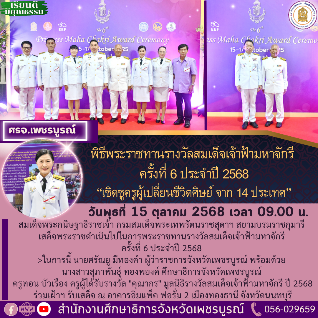 นางสาวสุนิตย์ ดีประหลาด ศึกษาธิการจังหวัดเพชรบุรี และกลุ่มอำนวยการ เข้าร่วมกิจกรรมเจริญพระพุทธมนต์และเจริญจิตตภาวนา ถวายพระพรชัยแด่ พระบาทสมเด็จพระเจ้าอยู่หัว สมเด็จพระนางเจ้าสิริกิติ์ พระบรมราชินีนาถ พระบรมราชชนนีพันปีหลวง และสมเด็จพระนางเจ้าฯ พระบรมราชินี ในวันที่ 28 พฤศจิกายน 2656 เวลา 16.00 น. ณ วัดใหญ่สุวรรณาราม วรวิหาร