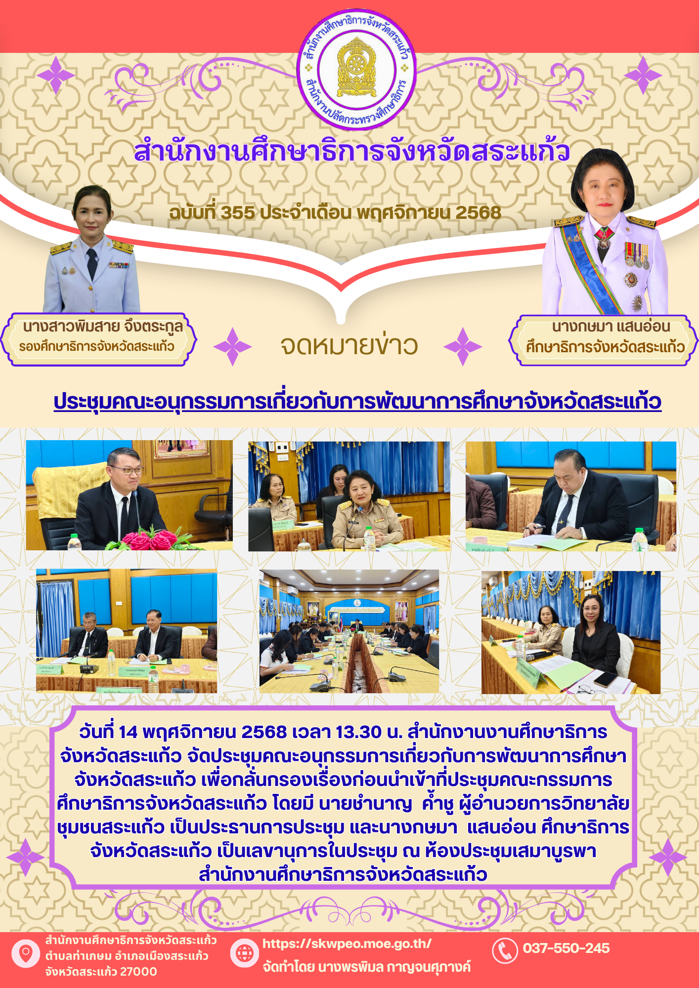 วันศุกร์ที่ 14 พฤศจิกายน 2568 เวลา 9.00.นางกษมา แสนอ่อน ศึกษาธิการจังหวัดสระแก้ว มอบหมายให้ นางนัธนรินทร์ ปูชู่ ผู้อำนวยการกลุ่มบริหารงานบุคคล และบุคลากรในสังกัด เข้าร่วมพิธีวางพานพุ่มดอกไม้สด เนื่องในวันพระบิดาแห่งฝนหลวงประจำปี 2568 โดยมี นายเชาวเนตร ยิ้มประเสริฐ รองผู้ว่าราชการจังหวัดสระแก้ว เป็นประธานในพิธีครั้งนี้ ณ หอประชุมปางสีดา ศาลากลางจังหวัดสระแก้ว