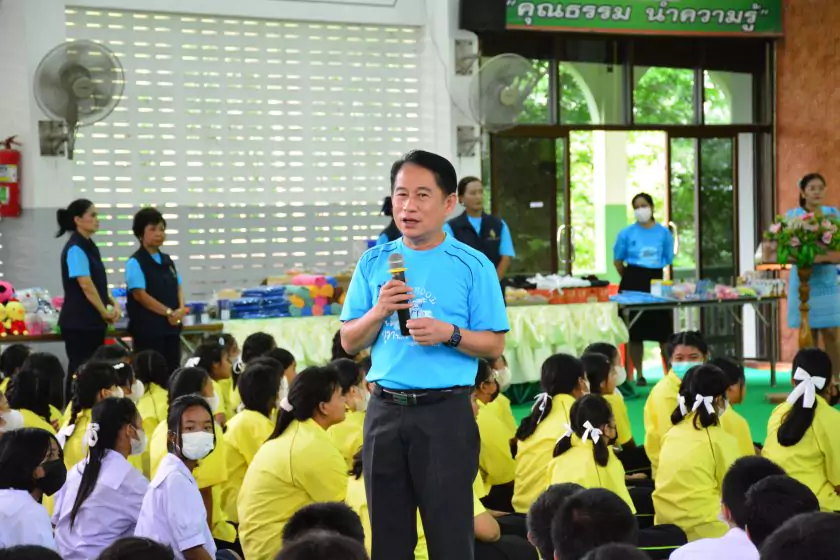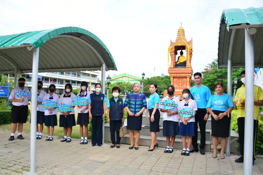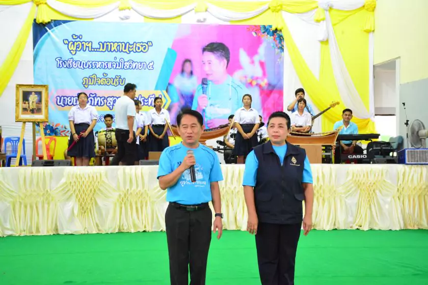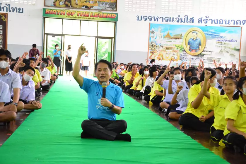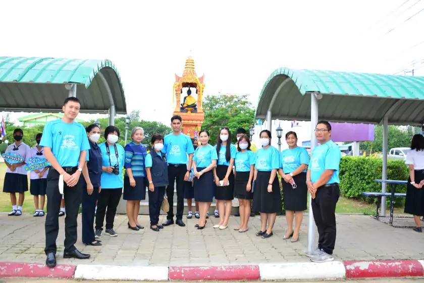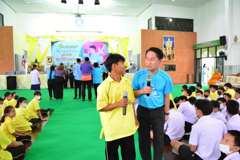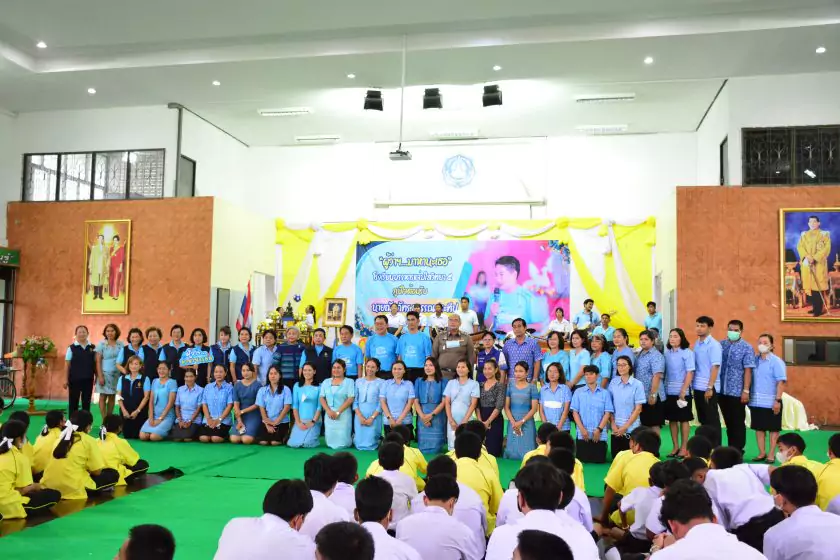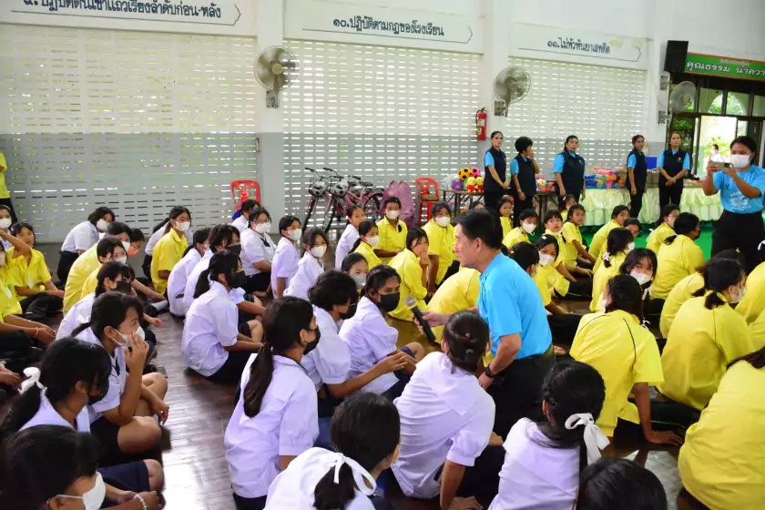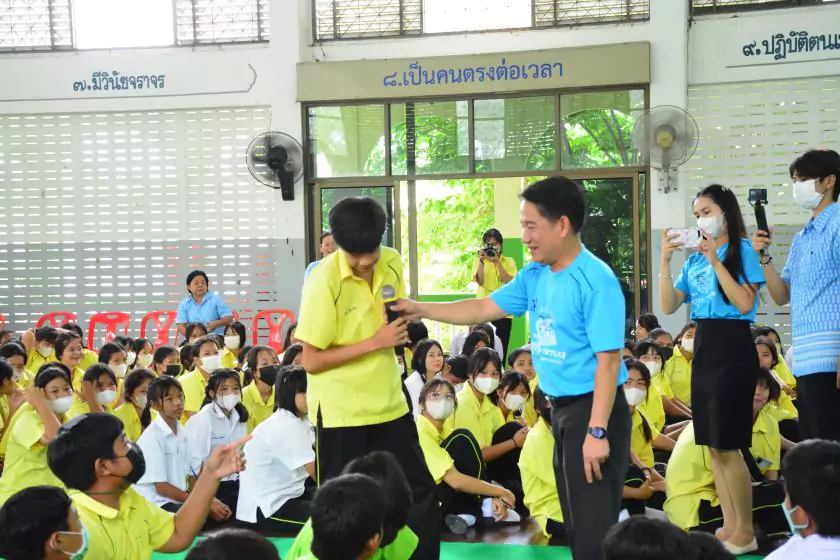 วันศุกร์ที่ ๔ สิงหาคม ๒๕๖๖ กิจกรรม “ผู้ว่าฯ…มาหานะเธอ” ครั้งที่ ๕๐ ตามโครงการผู้ว่าราชการจังหวัดกับการศึกษาสุพรรณบุรี ณ โรงเรียนบรรหารแจ่มใสวิทยา ๕ อำเภอสองพี่น้อง สังกัดสำนักงานเขตพื้นที่การศึกษามัธยมศึกษาสุพรรณบุรี นายณัฐภัทร สุวรรณประทีป ผู้ว่าราชการจังหวัดสุพรรณบุรี พร้อมด้วยเหล่ากาชาดจังหวัดสุพรรณบุรี นายอำเภอสองพี่น้อง และผู้นำชุมชน ผู้บริหารและข้าราชการสำนักงานเขตพื้นที่การศึกษามัธยมศึกษาสุพรรณบุรี ดร.พัฒนาพร ไทยพิบูลย์ รองศึกษาธิการจังหวัดสุพรรณบุรี และเจ้าหน้าที่สำนักงานศึกษาธิการจังหวัดสุพรรณบุรี ทำหน้าที่เลขานุการ โดยได้ร่วมเคารพธงชาติ สวดมนต์ ถาม-ตอบปัญหา แจกของรางวัลเพื่อส่งเสริมความรู้ ความเข้าใจเกี่ยวกับสถาบันหลักของชาติ ฝากข้อคิดในการพัฒนาโรงเรียนด้วยหลัก บ-ว-ร พัฒนานักเรียนโดยใช้โครงการเยาวชนคนดีศรีสุพรรณ ส่งเสริม และขยายผลไปสู่ครอบครัวคุณธรรม ท้ายสุด ผู้ว่าฯ ขอสัญญาจากนักเรียน ๒ ข้อ คือ ไม่ยุ่งเกี่ยวกับยาเสพติด และ ขอให้เป็นเด็กดี ของพ่อแม่ ไม่ทำให้พ่อแม่เสียใจ