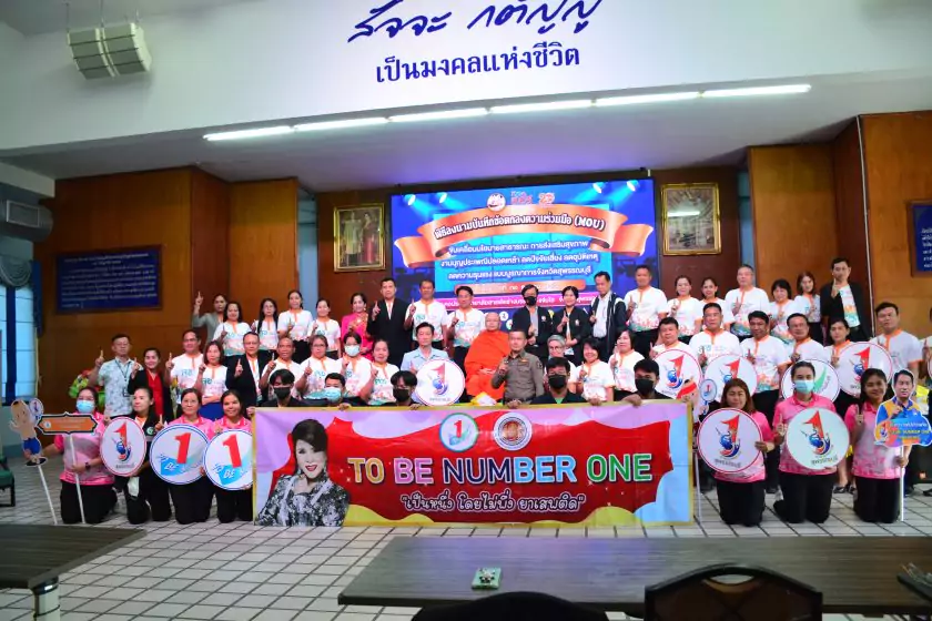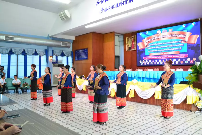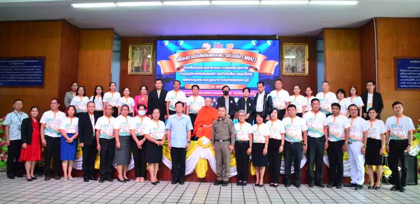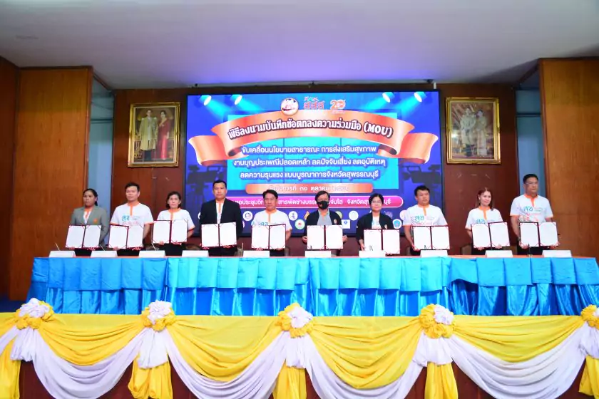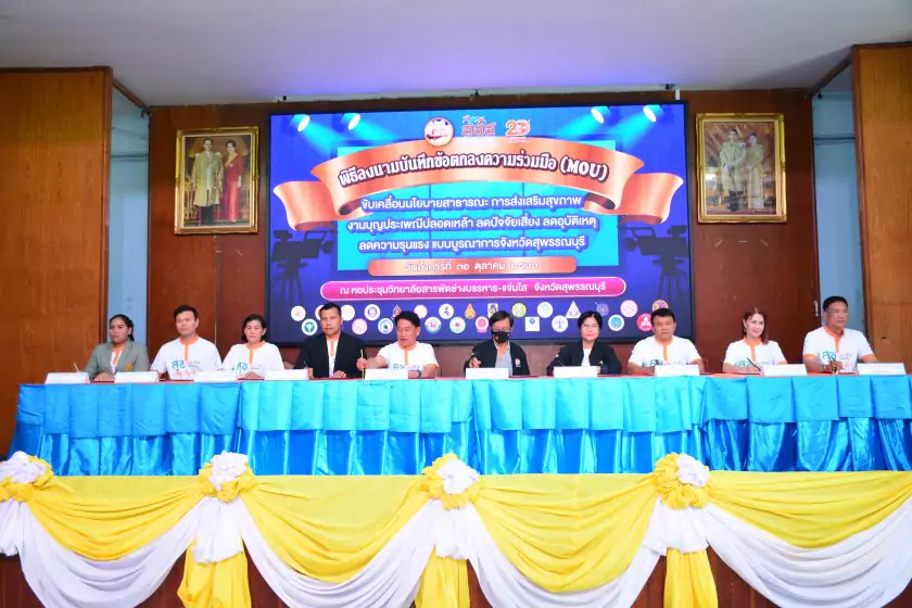 วันอังคารที่ ๓๑ ตุลาคม ๒๕๖๖ เวลา ๑๓.๓๐ น. นางสำเนา พงษ์อารีย์ ศึกษาธิการจังหวัดสุพรรณบุรี ร่วมพิธีลงนามบันทึกข้อตกลงความร่วมมือ (MOU) ขับเคลื่อนนโยบายสาธารณะ การส่งเสริมสุขภาพ งานบุญประเพณีปลอดเหล้า เพิ่มพื้นที่ปลอดภัย ลดปัจจัยเสี่ยง ลดอุบัติเหตุ ลดความรุณแรง แบบบูรณาการจังหวัดสุพรรณบุรี ณ ห้องประชุมวิทยาลัยสารพัดช่าง บรรหาร-แจ่มใส อำเภอเมืองสุพรรณบุรี จังหวัดสุพรรณบุรี โดยมี นายณัฐภัทร สุวรรณประทีป ผู้ว่าราชการจังหวัดสุพรรณบุรี เป็นประธานในพิธี