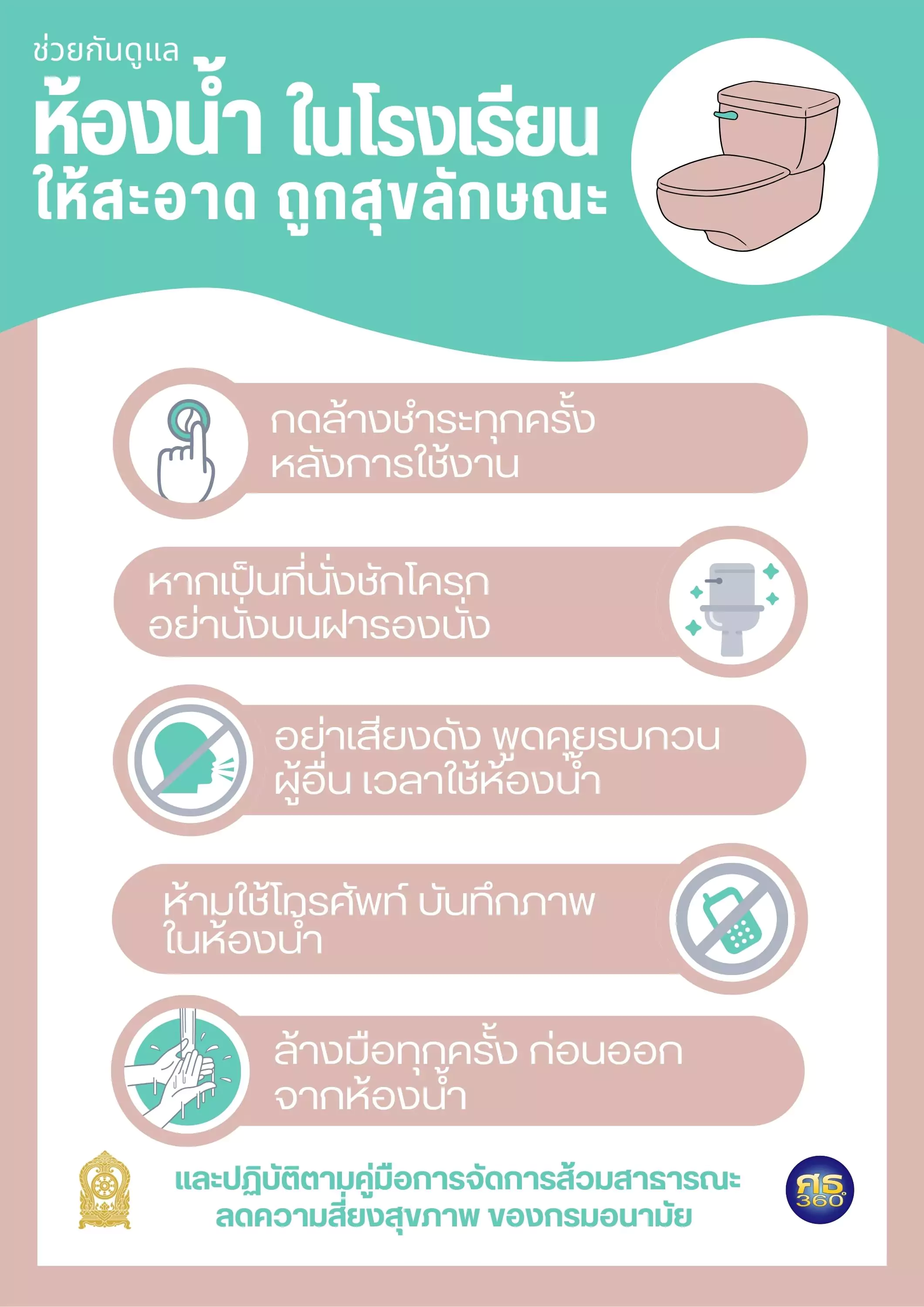 กระทรวงศึกษาธิการ โดยสำนักงานคณะกรรมการการศึกษาขั้นพื้นฐาน ขอเรียนว่า ได้มีนโยบายในการพัฒนาสถานศึกษาให้เป็นพื้นที่ปลอดภัยของผู้เรียน และมีการจัดสภาพแวดล้อมที่เอื้อต่อการมีสุขภาวะที่ดี รวมถึงให้ความสำคัญในการดูแลห้องน้ำในโรงเรียนให้สะอาด และถูกสุขลักษณะ จึงได้ดำเนินการแจ้งให้สำนักงานเขตพื้นที่การศึกษาทุกเขต กำชับโรงเรียนทุกแห่งในสังกัด ให้ปฏิบัติตามคู่มือการจัดการส้วมสาธารณะ ลดความสี่ยงสุขภาพ ของกรมอนามัย กระทรวงสาธารณสุข เพื่อให้เกิดความตระหนักถึงความสำคัญในเรื่องดังกล่าว และให้เป็นไปตามแผนแม่บทพัฒนาส้วมสาธารณะไทย ระยะที่ 3 (พ.ศ. 2556 – 2559) อันเป็นการส่งเสริมสุขภาพที่ดีของนักเรียนและบุคลากรในโรงเรียน